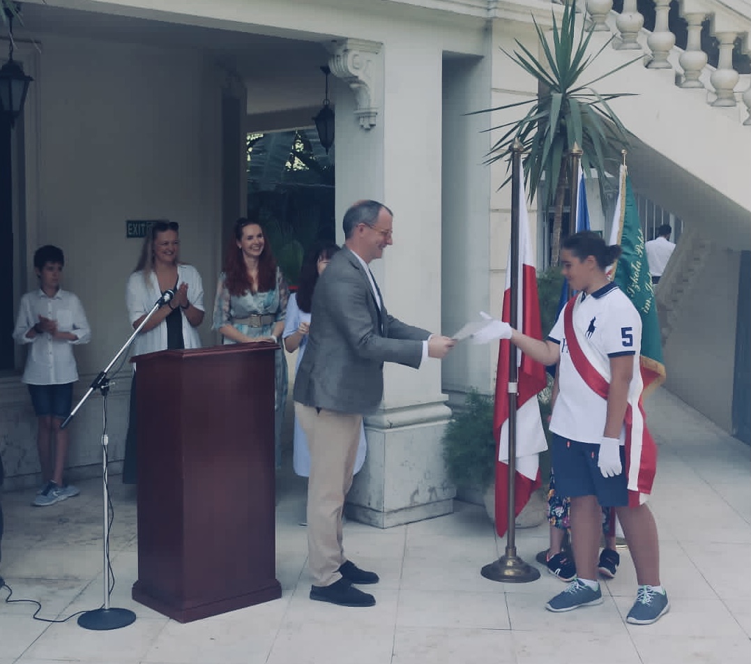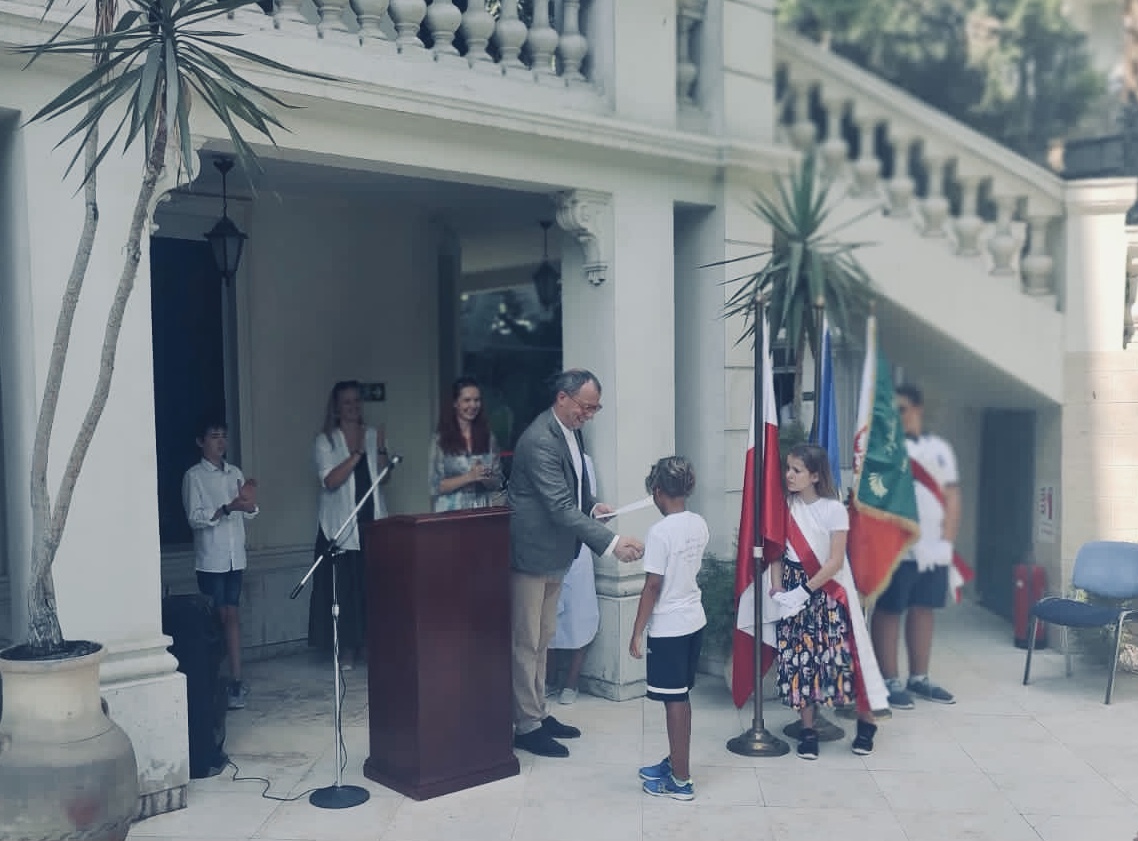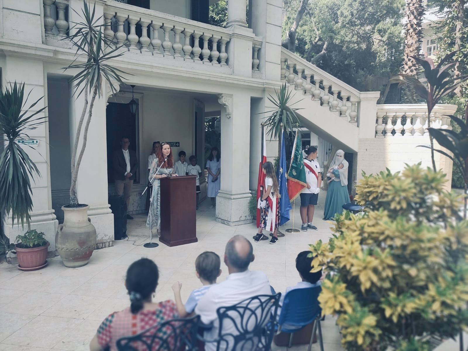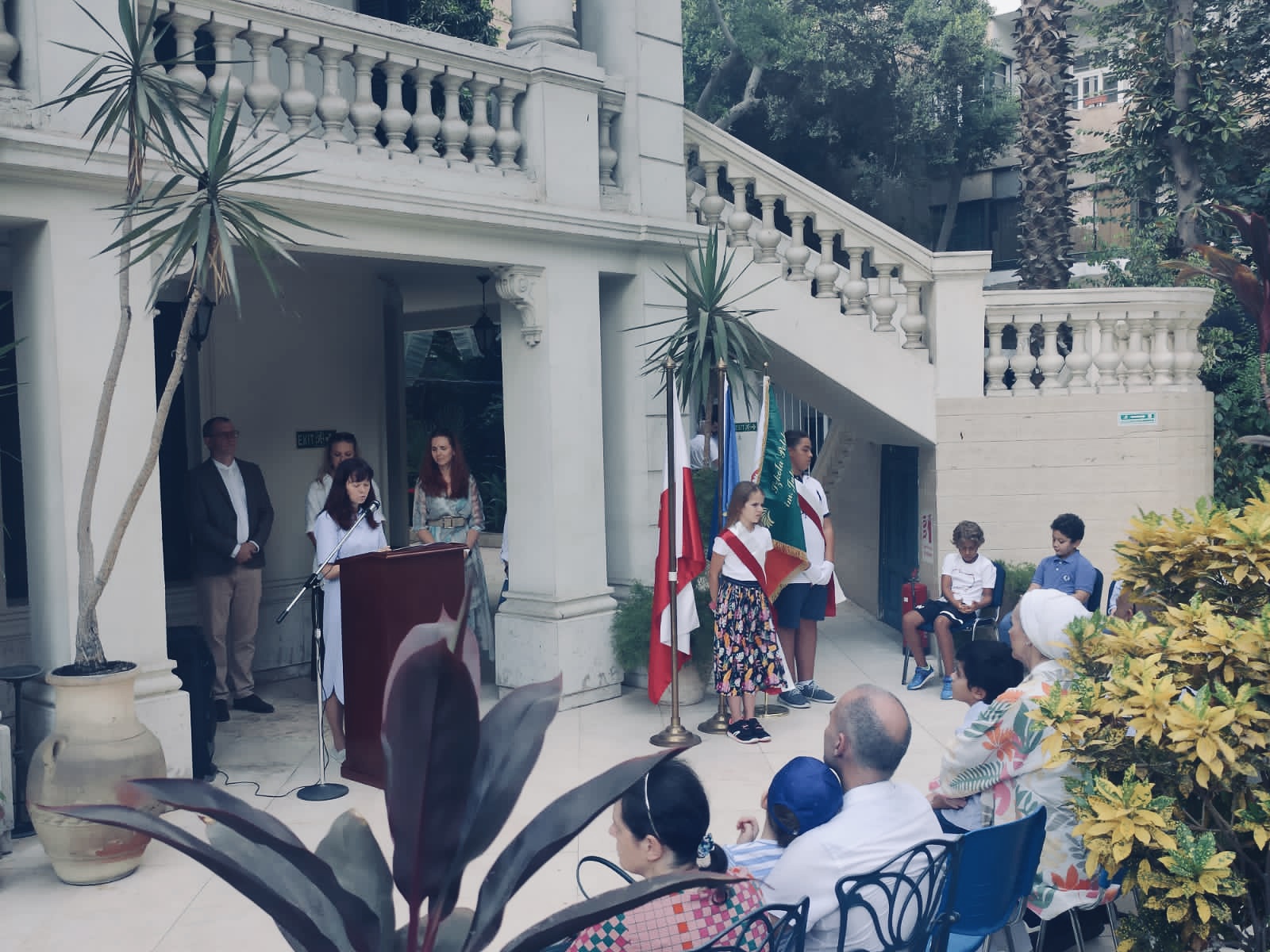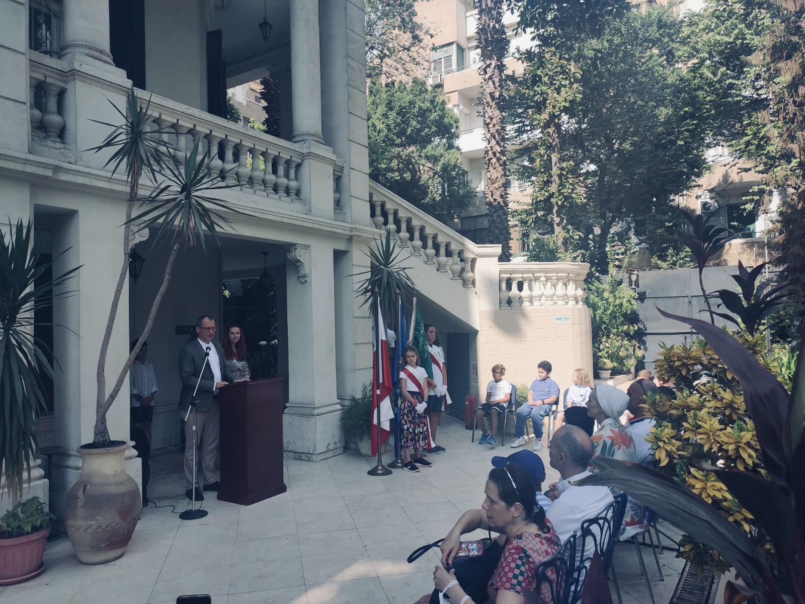 W ogrodzie Ambasady zaprezentowany został uroczyście sztandar Szkoły Polskiej im. Juliusza Marii Dzieduszyckiego oraz wybrzmiał hymn Rzeczypospolitej Polskiej. Zgromadzonych uczniów oraz rodziców powitali: Ambasador Polski w Egipcie Pan Michał Łabenda, Dyrektor Szkoły Polskiej Pani Monika Mucha-El-Serougi oraz Prezes Stowarzyszenia Polonii w Egipcie Pani Ewa Świerczyńska.
