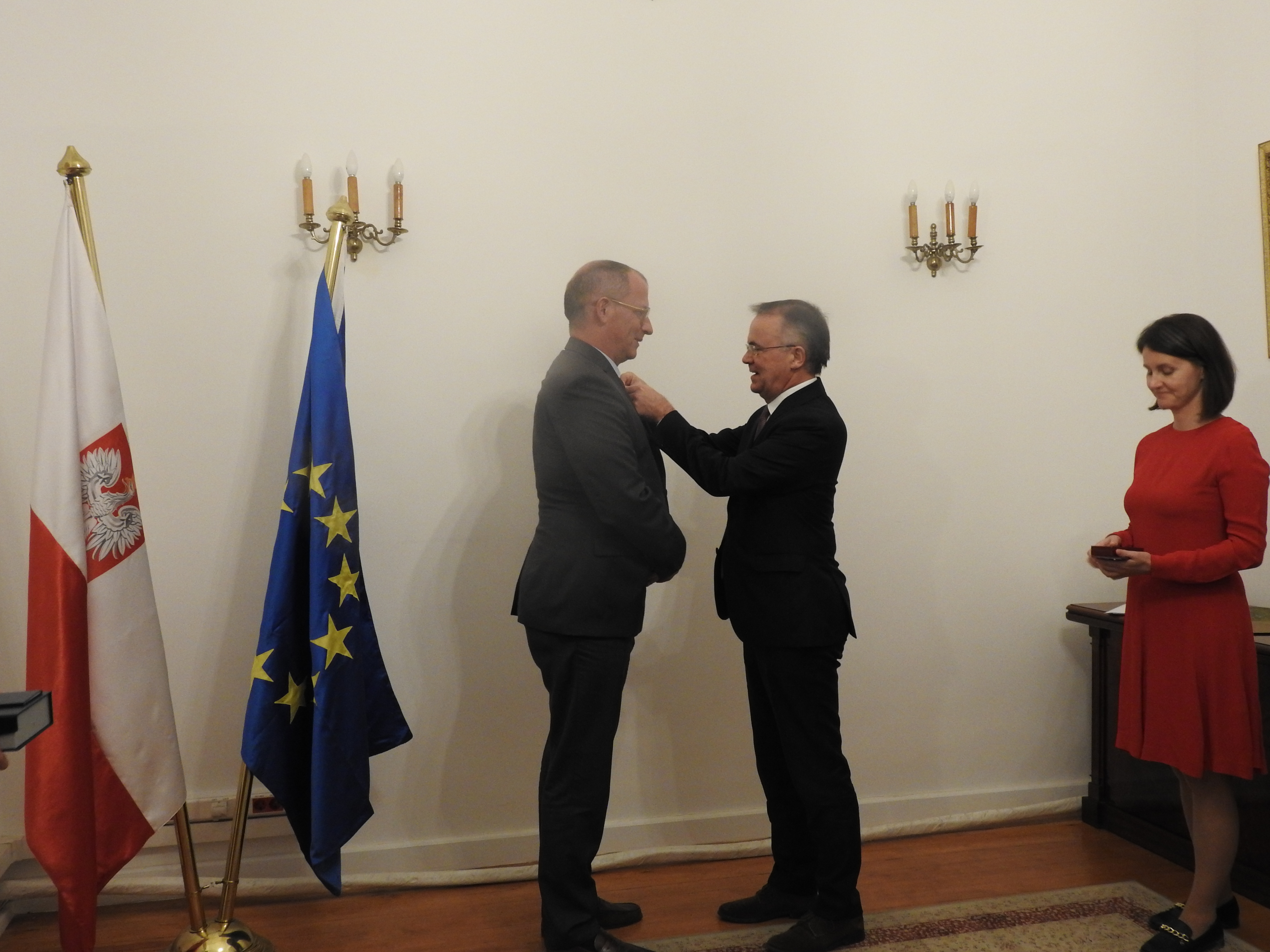 Minister Jarosław Sellin podczas uroczystości w Ambasadzie RP wręczył również odznaczenia osobom zasłużonym dla promocji kultury polskiej; wśród wyróżnionych znaleźli się Ambasador Michał Łabenda, prof. Jan Wiktor Sienkiewicz oraz członek zespołu Ambasady Bartosz Andrzejewski.
