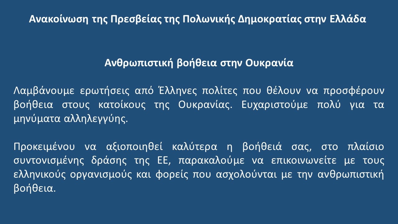 Ανακοίνωση της Πρεσβείας της Πολωνικής Δημοκρατίας στην Ελλάδα σχετικά με την ανθρωπιστική βοήθεια προς την Ουκρανία