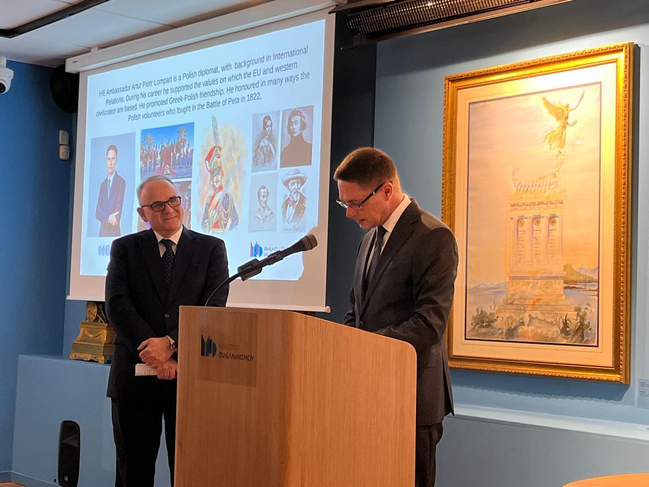 Όπως τόνισε ο Πρέσβης Artur Lompart στην ομιλία του κατά τη διάρκεια της τελετής, έχει προσηλωθεί στις ιδέες του Φιλελληνισμού και τα τελευταία χρόνια, με τη δράση του, έχει προσπαθήσει να προωθήσει τη γνώση και να καλλιεργήσει τη μνήμη του φιλελληνικού κινήματος, το οποίο ενέπνευσε Ευρωπαίους και Πολωνούς να αγωνιστούν για την ελευθερία. Αυτό εκφράστηκε, μεταξύ άλλων, με την στήριξη εκδηλώσεων μνήμης των Πολωνών Φιλελλήνων, των οποίων η αφοσίωση και η θυσία στον ελληνικό αγώνα για την ανεξαρτησία εκτιμάται και μνημονεύεται από τους Έλληνες μέχρι σήμερα. Η Πρεσβεία της Πολωνικής Δημοκρατίας στην Αθήνα συνεργάζεται με πολλούς φορείς στην Ελλάδα και την Πολωνία, και ανάμεσα στους καρπούς αυτής της συνεργασίας βρίσκεται ο πρόσφατα δημοσιευμένος τόμος με τίτλο «Greek War of Independence and Polish Philhellenism (1821-1833)», που εκδόθηκε από κοινού με το Εθνικό Ίδρυμα Ερευνών και το Τμήμα Artes Liberales του Πανεπιστημίου της Βαρσοβίας.