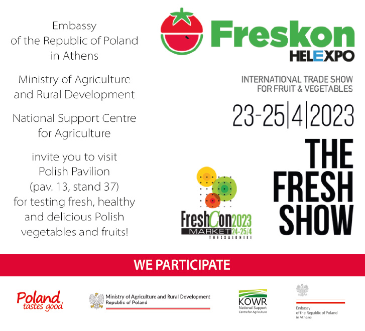 Πολωνικό Περίπτερο θα λειτουργεί στο Διεθνές Εμπορικό Γεγονός Φρέσκων Φρούτων και Λαχανικών Freskon Helexpo στο Διεθνές Εκθεσιακό και Συνεδριακό Κέντρο στην Θεσσαλονίκη, 23-25.04.2023.
