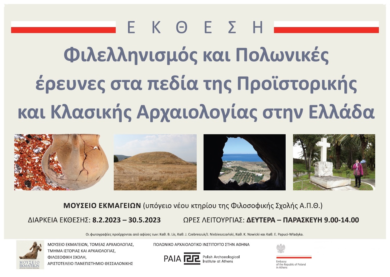 Το Μουσείο Εκμαγείων, Τομέας Αρχαιολογίας, Τμήμα Ιστορίας και Αρχαιολογίας, Φιλοσοφική Σχολή του Αριστοτέλειου Πανεπιστήμιου Θεσσαλονίκης μαζί με το Πολωνικό Αρχαιολογικό Ινστιτούτο στην Αθήνα και την Πρεσβεία της Πολωνικής Δημοκρατίας στην Αθήνα έχουν την τιμή να σας προσκαλέσουν στα εγκαίνια της έκθεσης «Φιλελληνισμός και Πολωνικές έρευνες στα πεδία της Προϊστορικής και Κλασικής Αρχαιολογίας στην Ελλάδα», την Τετάρτη 8 Φεβρουαρίου 2023, στις 18.30, στο Μουσείο Εκμαγείων (υπόγειο νέου κτηρίου της Φιλοσοφικής Σχολής Α.Π.Θ.)