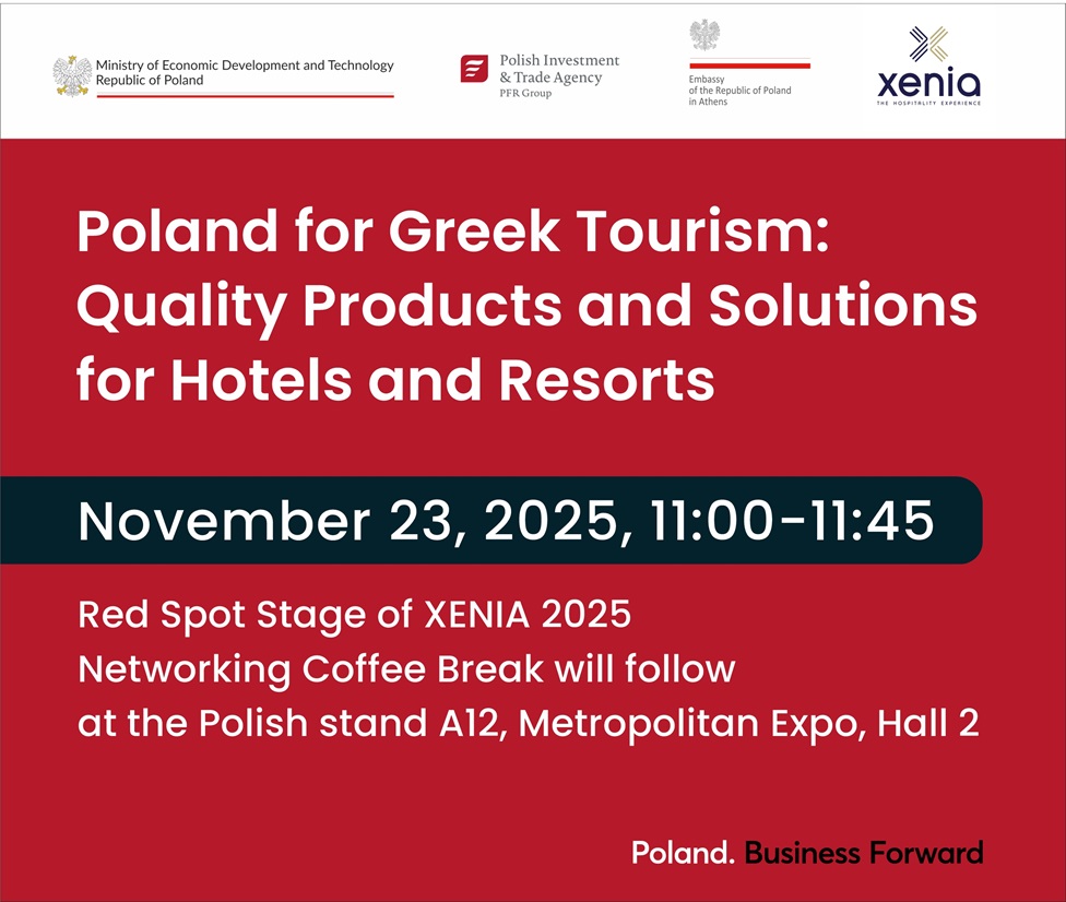 Το σεμινάριο θα πραγματοποιηθεί την Κυριακή 23 Νοεμβρίου 2025, ώρα 11:00–11:45, κατά τη διάρκεια της Διεθνούς Έκθεσης Τουρισμού XENIA 2025, στο Metropolitan Expo Center, Hall 2, Red Spot Stage. Η εκδήλωση διοργανώνεται σε συνεργασία με το Υπουργείο Ανάπτυξης και Τεχνολογίας της Πολωνίας. Στο πλαίσιο του σεμιναρίου, θα παρουσιαστούν σύγχρονες πολωνικές λύσεις, προϊόντα υψηλής ποιότητας και καινοτόμος σχεδιασμός για τον ξενοδοχειακό κλάδο της Ελλάδας, καθώς και νέες ευκαιρίες ενίσχυσης της διμερούς οικονομικής συνεργασίας. Για όσους ενδιαφέρονται για την συμμετοχή παρακαλούμε επικοινωνήστε στο athens@paih.gov.pl ή https://www.xenia.gr/en/online-invitation/ για να λάβετε την barcode πρόσκλησή σας για την έκθεση ΧΕΝΙΑ.