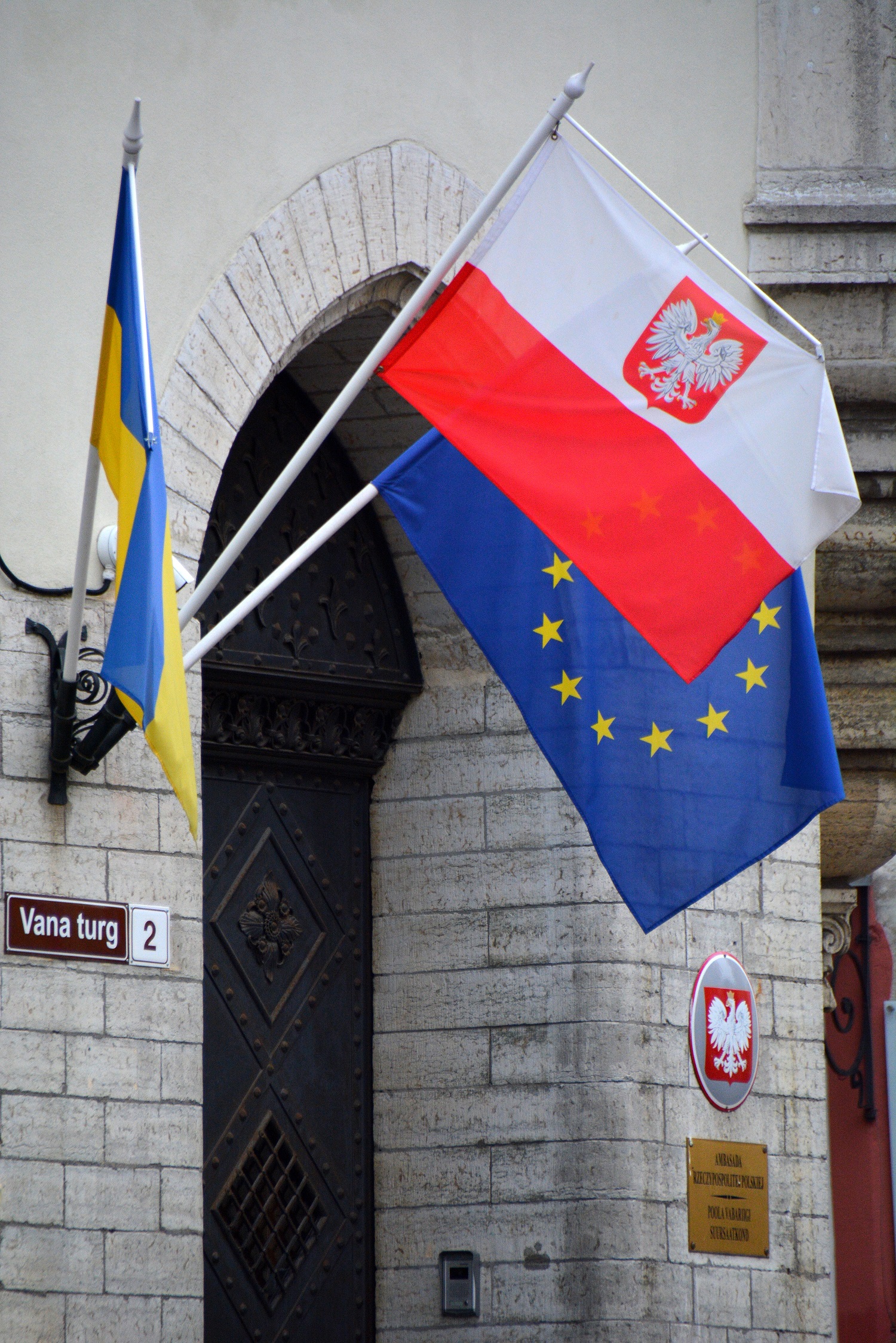 Obecna siedziba Ambasady RP w Tallinnie mieści się blisko rynku tallińskiej starówki, w kamienicy wzniesionej w latach 1903-1904 na potrzeby banku. Architekci Otto Schott i Wilhelm Neumann projektując gmach w historycznej okolicy starali się nawiązać do pobliskich gotyckich i barokowych zabudowań. Zachowali z wcześniejszych kamienic stojących na tym samym miejscu m.in. gotycki portal (od strony ul. Suur-Karja), rzeźbione barokowe drzwi (obecnie po rekonstrukcji), a także wiatrowskazy. Wspomniane drzwi ukazują herby gospodarza budynku, burmistrza Thomasa von Drenteln i jego żony oraz apostołów i wojownika.