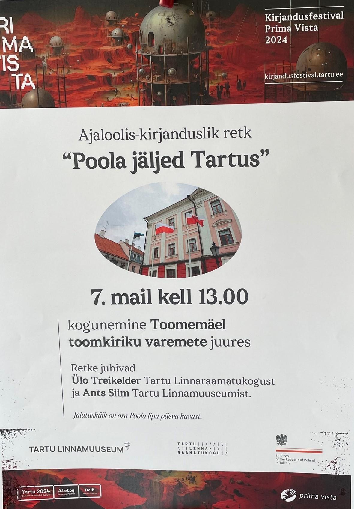 7 maja br. odbył się historyczno-literacki spacer „Polskim szlakiem przez Tartu” pod przewodnictwem kustosza Muzeum Miejskiego Antsa Siima i dyrektora Biblioteki Miejskiej Ülo Treikeldera. Program rozpoczął się przy ruinach katedry – głównej siedzibie Muzeum Uniwersyteckiego i zakończył majówkowym piknikiem przy wierzbie Bolesława Hryniewieckiego w Ogrodzie Botanicznym Uniwersytetu w Tartu. Ambasada wyposażyła uczestników w publikacje wydane nakładem MSZ RP „About Polska” i „Ślady polskie w Estonii. Polish Traces in Estonia”. Dedykowany Tartu rozdział z książki Grzegorza Kozłowskiego, przetłumaczony został specjalnie na potrzeby danego wydarzenia na język estoński i załączony do egzemplarzy promocyjnych. Staraniem placówki, z myślą o jednolitej identyfikacji wizualnej uczestników Spaceru oraz względach praktycznych, przygotowano plecaki-torby na książki z logo 440 lat polskiej flagi w Tartu. Rekordowa liczba uczestników, którzy stawili się na miejsce zbiórki (164 osoby) znacznie przerosła prognozowaną (25-40 uczestników). Powodzenie, jakim cieszył się projekt pilotażowy, sprawiło, że spacer został włączony do oferty edukacyjnej Biblioteki i Muzeum. Z inicjatywy Ambasady powtórzono go (w nieco zmodyfikowanej wersji) 9 i 16 maja br.