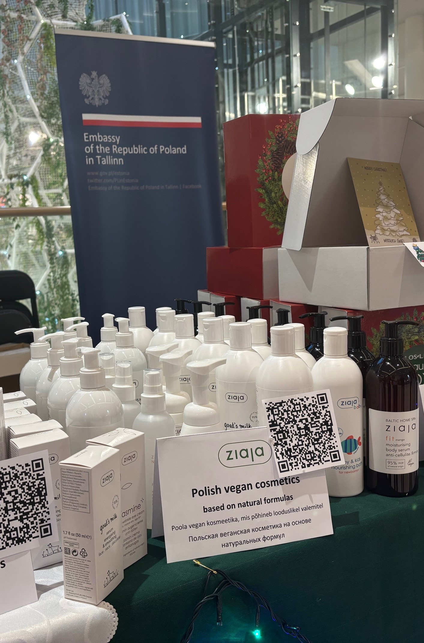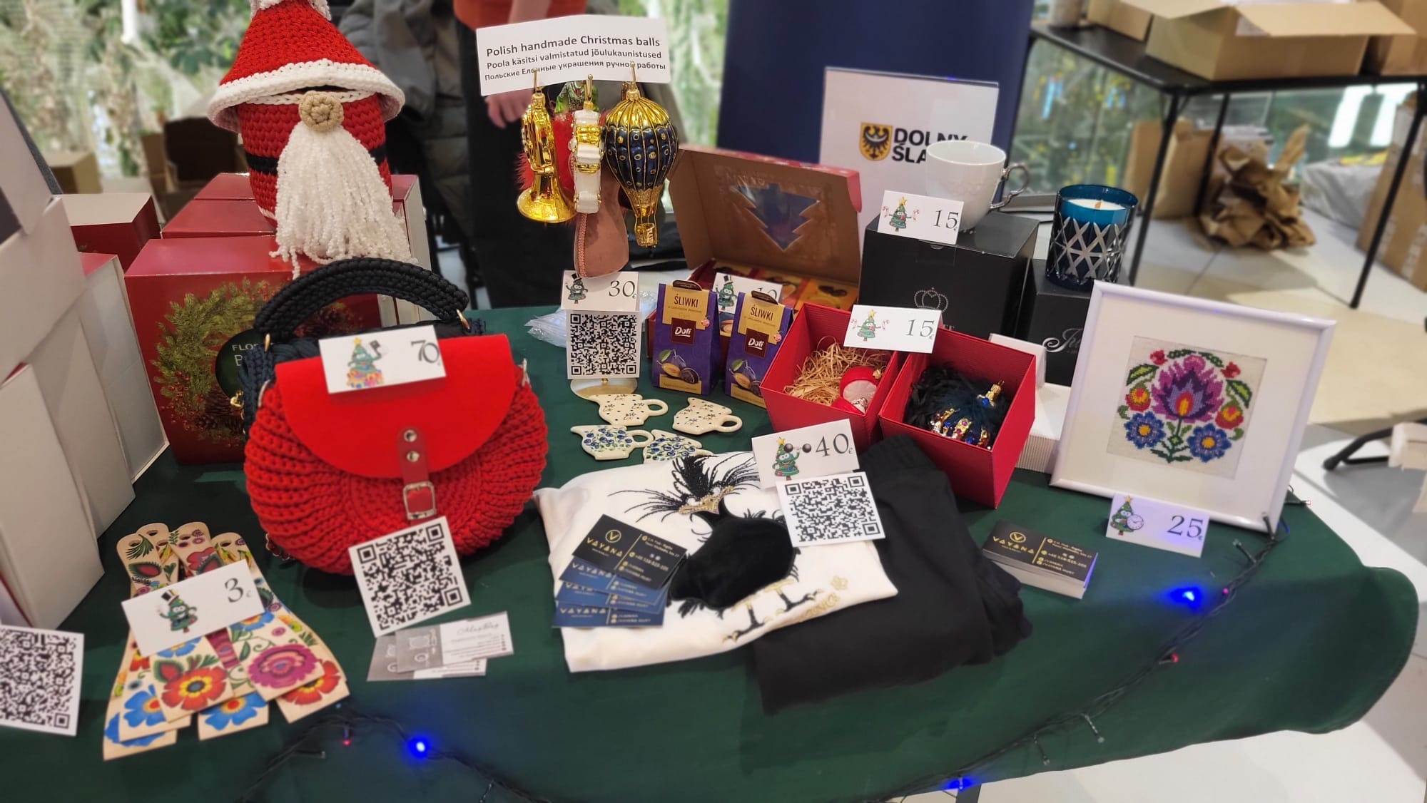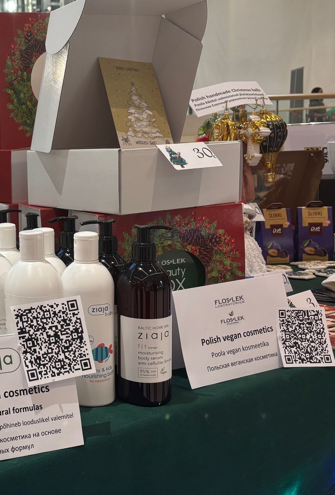 Zespół Ambasady RP w Tallinnie ponownie przygotował polskie stoisko, a dzięki współpracy z polskimi przedsiębiorcami mogliśmy poszczycić się największym stanowiskiem z bardzo szerokim asortymentem. W swojej ofercie mieliśmy m.in. pyszne i różnorodne produkty firmy Profi, Łowicz, Tarczyński oraz Kopernik. Odwiedzający mogli wybierać spośród różnorodnych kosmetyków firm Ziaja, Dr Irena Eris oraz Flos-Lek. Do zakupu były również przepiękne, ręcznie wykonane bombki z Fabryki Bombek w Staszowie, ręcznie robione torebki od firmy MagBag Magdalena Wójcik, odzież od firmy Vayana, czy wiele lokalnych produktów przesłanych z województwa dolnośląskiego oraz firmy LOT. Oczywiście nie mogło zabraknąć smakołyków przygotowanych przez samych pracowników Ambasady, a wśród których prym wiodły pierogi, bigos czy oponki.