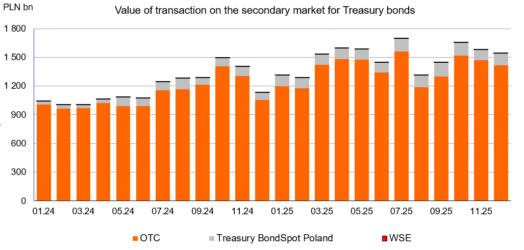 In December the value of transactions on the Treasury bond secondary market decreased by 2.3% m/m and amounted to PLN 1,544.8bn. Trading in bonds focused on the non-regulated OTC market (91.8%), while the share of the TBS Poland electronic platform in the total turnover value was 8.1% and the share of WSE was only 0.03%.