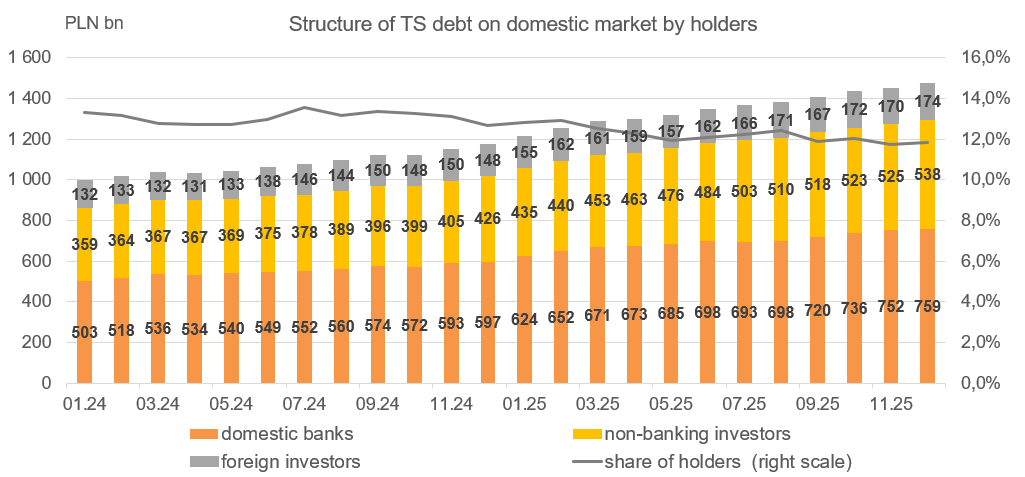 In December debt in domestic TS increased by PLN 24.3bn and amounted to PLN 1,470.7 billion. This was the result of an increase in debt towards all three groups of investors: domestic banks (including the NBP), domestic non-bank investors and non-residents by PLN 6.5bn (to PLN 758.6 billion), PLN 13.2bn (to PLN 537.9 billion) and PLN 4.6bn (to PLN 174.3 billion), respectively. As a result, the share of domestic banks (including the NBP) decreased to 51.6% from 52.0% in November (51.0% at the end of December 2024), while the share of domestic non-banking investors in the domestic TS debt increased to 36.6% from 36.3% in the previous month (36.4% at the end of December 2024). However, the share of non-residents in the domestic TS debt increased to 11.8% compared to 11.7% in November (12.7% at the end of December 2024).