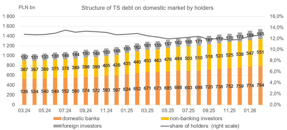 In February, debt in domestic TS increased by PLN 31.0bn and amounted to PLN 1,539.6 billion. This was the result of an increase in debt towards all three groups of investors: domestic banks (including the NBP), domestic non-bank investors and non-residents by PLN 19.6bn (to PLN 793.7 billion), PLN 4.4bn (to PLN 551.0 billion) and PLN 7.0bn (to PLN 194.9 billion), respectively. As a result, the share of domestic banks (including the NBP) increased to 51.6% from 51.3% in January (51.6% at the end of December 2025), while the share of domestic non-banking investors in the domestic TS debt decreased to 35.8% from 36.2% in the previous month (36.6% at the end of December 2025). However, the share of non-residents in the domestic TS debt increased to 12.7% compared to 12.5% in December (11.8% at the end of December 2025).