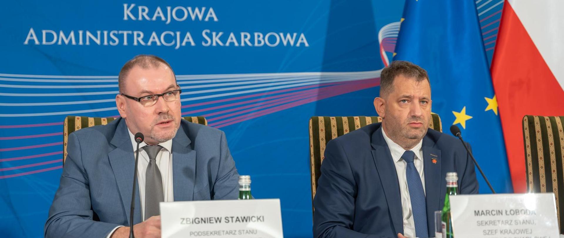 Szef KAS Marcin Łoboda i zastępca Szef KAS Zbigniew Stawicki podczas konferencji