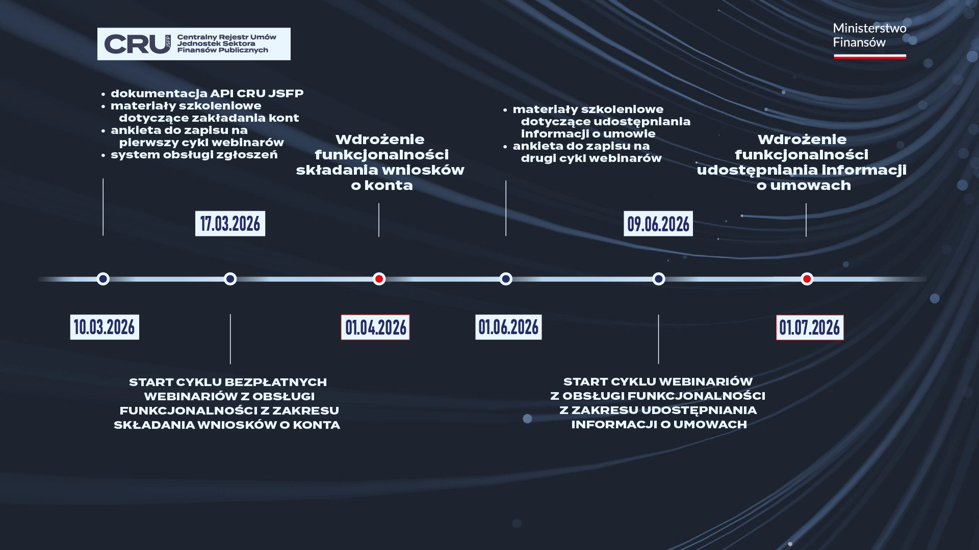 - pierwszy z cyklu, bezpłatny webinar dotyczący obsługi funkcjonalności systemu CRU JSFP z zakresu udostępniania informacji o umowach,