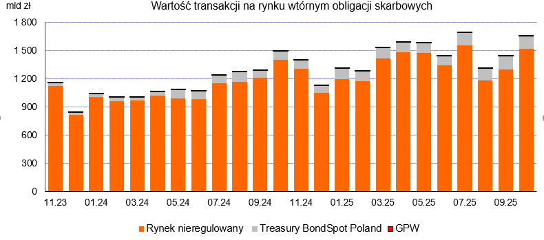 W październiku wartość transakcji na rynku wtórnym obligacji skarbowych zwiększyła się o 14,7% m/m do poziomu 1.656,5 mld zł. Obrót obligacjami koncentrował się na nieregulowanym rynku międzybankowym (91,7%), podczas gdy udział platformy elektronicznej TBS Poland w łącznej wartości obrotów wyniósł 8,2%, a udział rynków regulowanych stanowił 0,04%.