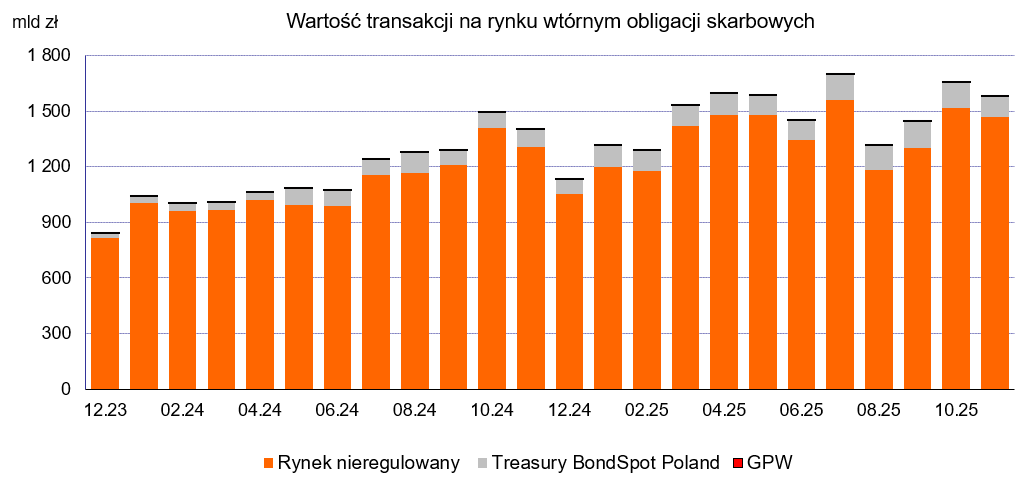 W listopadzie wartość transakcji na rynku wtórnym obligacji skarbowych zmniejszyła się o 4,5% m/m do poziomu 1.581,4 mld zł. Obrót obligacjami koncentrował się na nieregulowanym rynku międzybankowym (92,8%), podczas gdy udział platformy elektronicznej TBS Poland w łącznej wartości obrotów wyniósł 7,1%, a udział GPW stanowił 0,02%.