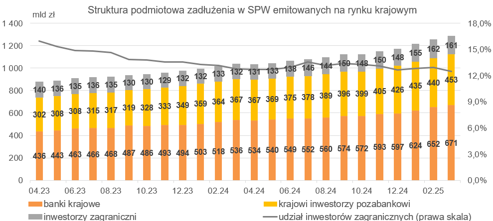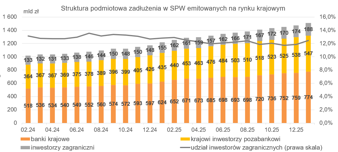 W styczniu zadłużenie w krajowych SPW wzrosło o 37,9 mld zł i wyniosło 1.508,7 mld zł. Złożył się na to przyrost zadłużenia wobec wszystkich trzech grup inwestorów: banków (w tym NBP), krajowych inwestorów pozabankowych i nierezydentów o odpowiednio 15,5 mld zł (do 774,1 mld zł), 8,7 mld zł (do 546,5 mld zł) i 13,7 mld zł (do 188,0 mld zł). W rezultacie udział banków (w tym NBP) w zadłużeniu w krajowych SPW na koniec stycznia obniżył się do 51,3% z 51,6% w grudniu (51,0% na koniec grudnia 2024 r.), a udział inwestorów pozabankowych zmniejszył się do 36,2% z 36,6% w poprzednim miesiącu (36,4% na koniec grudnia 2024 r.). Udział nierezydentów w zadłużeniu w krajowych SPW zwiększył się natomiast do 12,5% z 11,8% na koniec grudnia (12,7% na koniec grudnia 2024 r.).