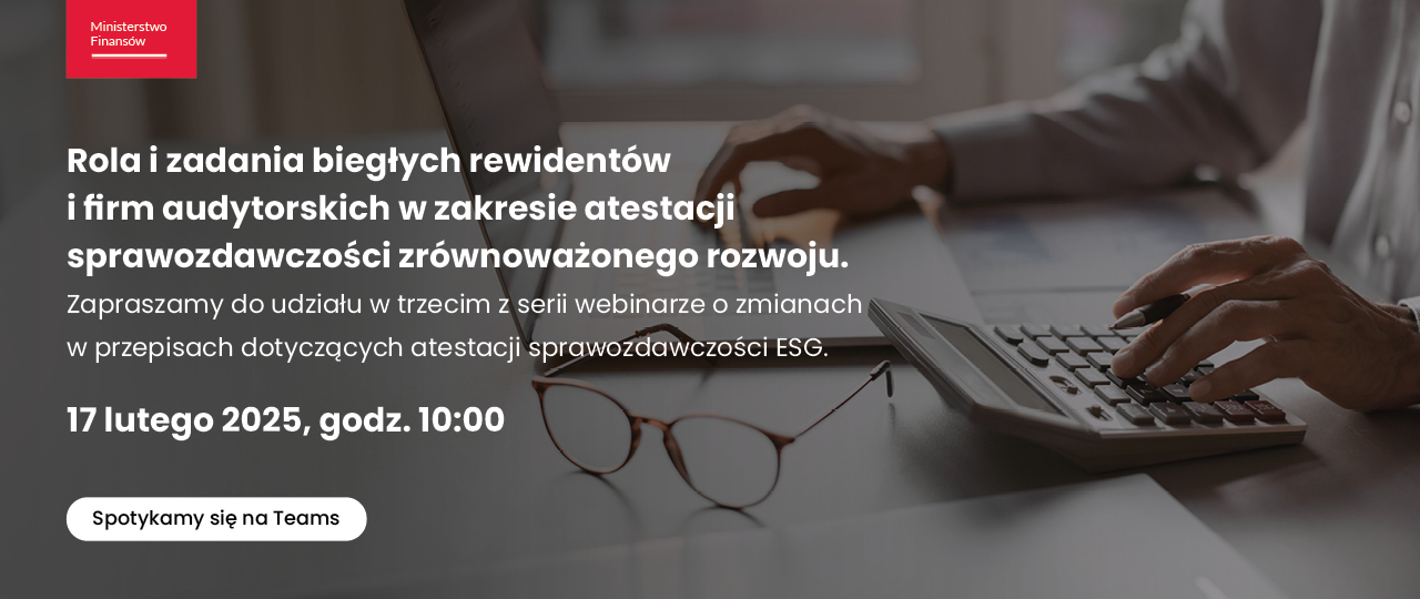 - Podczas trzeciego webinaru eksperci MF, PANA i PIBR opowiedzą o najważniejszych zmianach w przepisach ustawy o biegłych rewidentach w zakresie atestacji sprawozdawczości zrównoważonego rozwoju, o krajowym standardzie usług atestacji sprawozdawczości zrównoważonego rozwoju (KSUA 3002PL), o pracach nad standardem atestacji sprawozdawczości zrównoważonego rozwoju, który ma przyjąć Komisja Europejska oraz o zmianach wynikających dla samorządu i biegłych rewidentów (obowiązkowe doskonalenie zawodowe, rejestr biegłych rewidentów).