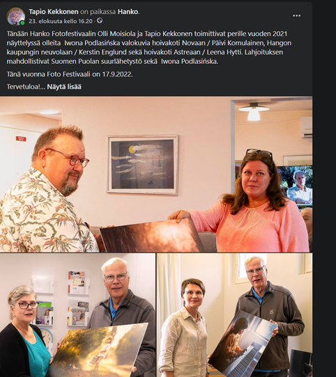 Ta akcja została zaplanowana podczas wystawy polskiej artystki Iwony Podlasińskiej na Festiwalu Fotografii w Hanko jesienią 2021 r. Dochód ze sprzedaży zdjęć podczas wystawy w Hanko trafił do Szpitala Dziecięcego w Helsinkach. Pozostałe zdjęcia zostały przekazane do klinik i dziecięcych ośrodków opieki w Hanko i regionie oraz do Nowego Szpitala Dziecięcego w Helsinkach.