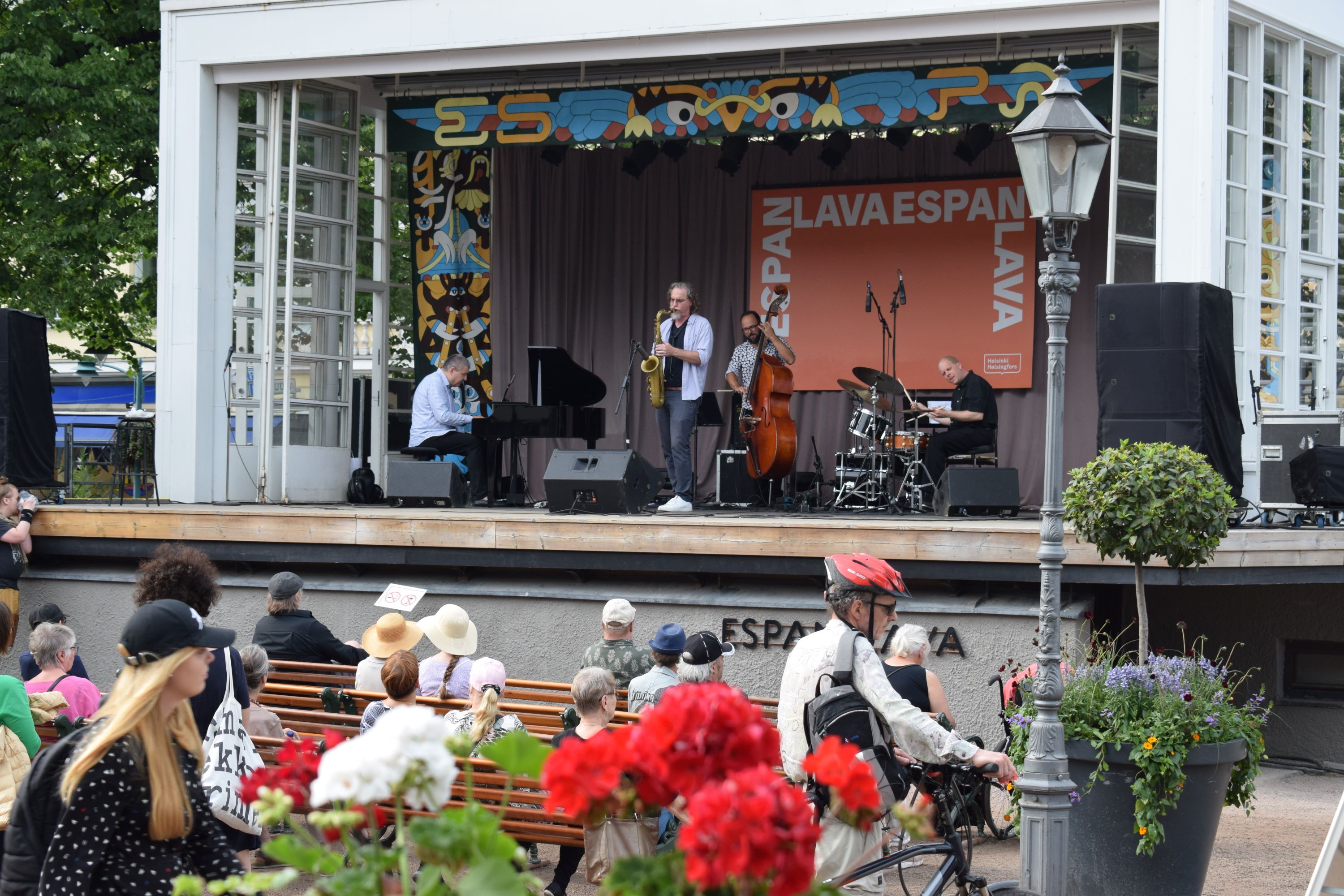 Koncert jazzowy w wykonaniu kwartetu wyszehradzkiego na scenie letniej w Helsinkach.