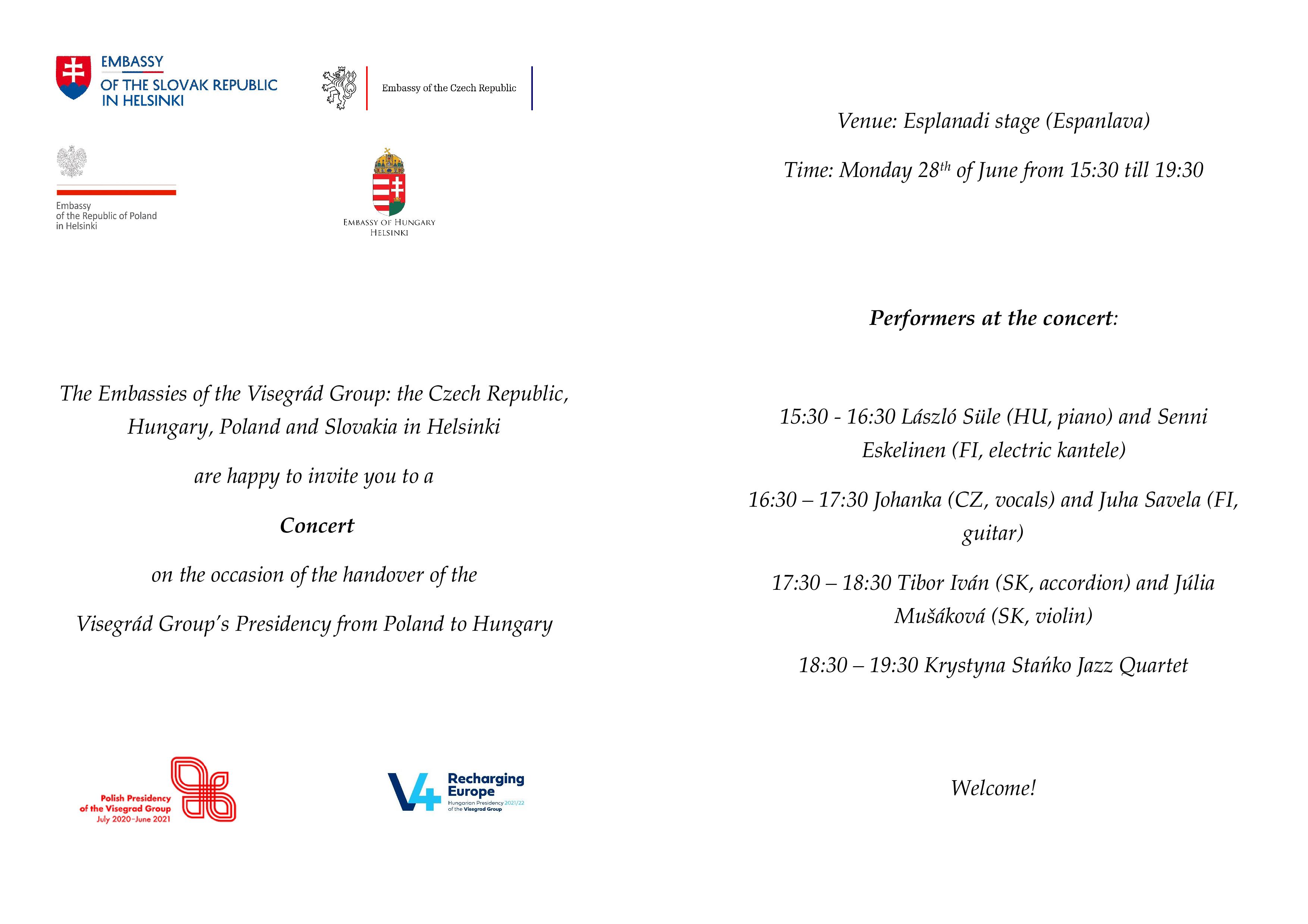 Pod koniec Polskiej Prezydencji w Grupie Wyszehradzkiej, w dniu 28 czerwca br. na scenie otwartej w centrum Helsinek odbyło się oficjalne przekazanie Prezydencji Wyszehradzkiej węgierskim kolegom. Przekazaniu Prezydencji towarzyszył koncert składający się z występów czterech zespołów muzycznych z krajów V4. Polskę reprezentował kwartet jazzowy KRYSTYNA STAŃKO QUARTET.
