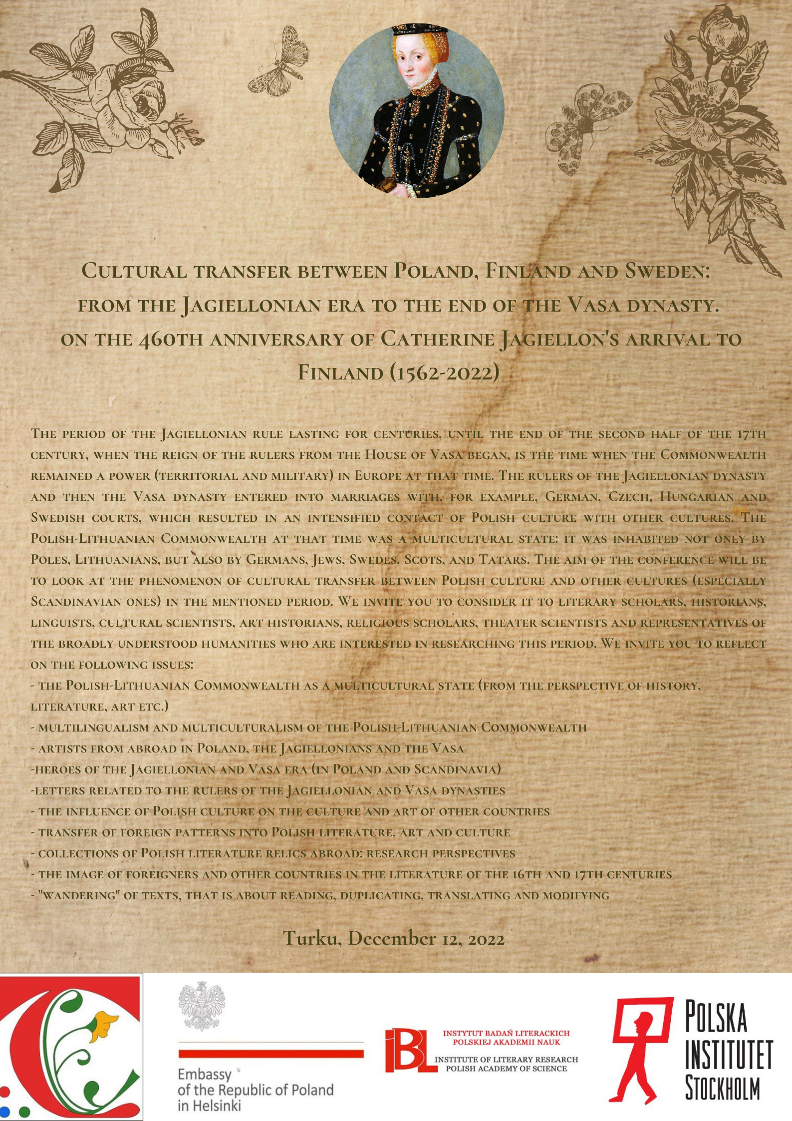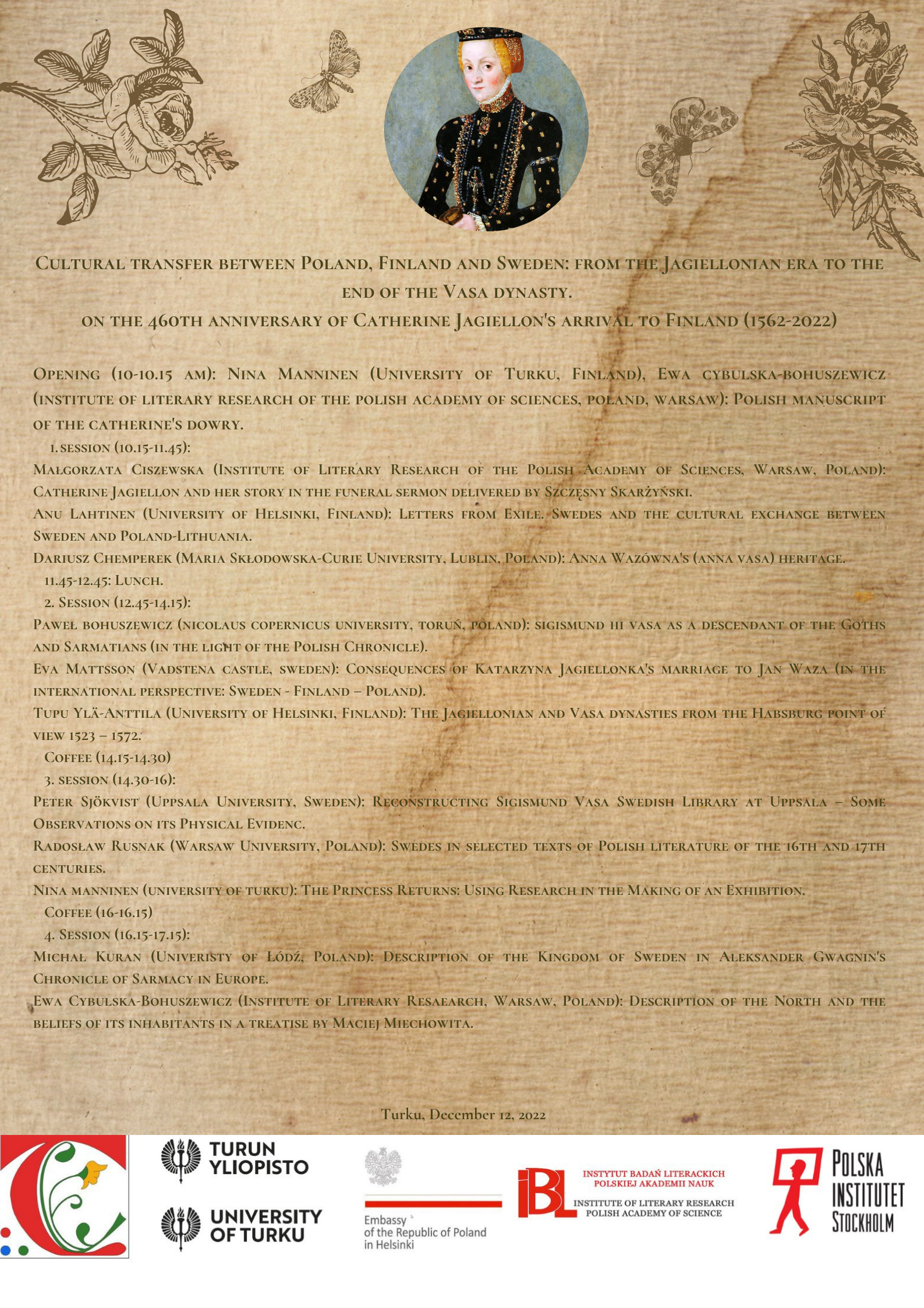 Konferencja zbiegająca się z faktem 460-tej rocznicy przyjazdu Katarzyny Jagiellonki do Turku została zorganizowana przez Instytut Badań Literackich Polskiej Akademii Nauk (@TAG) w Warszawie, Tucemems Turku Centre for Medieval and Early Modern Studies, Instytut Badań Literackich Uniwersytetu w Turku Ambasadę RP w Helsinkach oraz Instytut Polski w Sztokholmie.