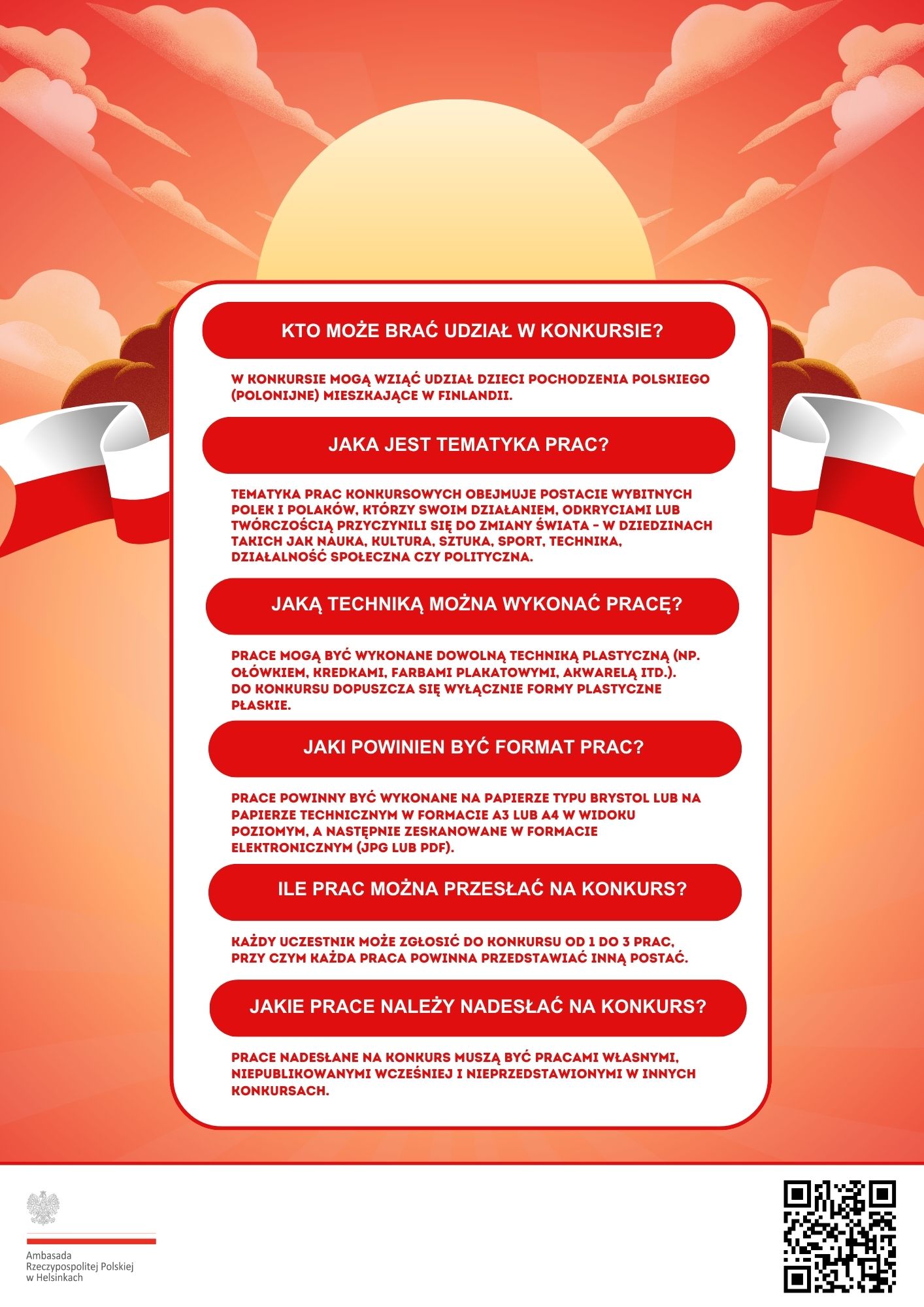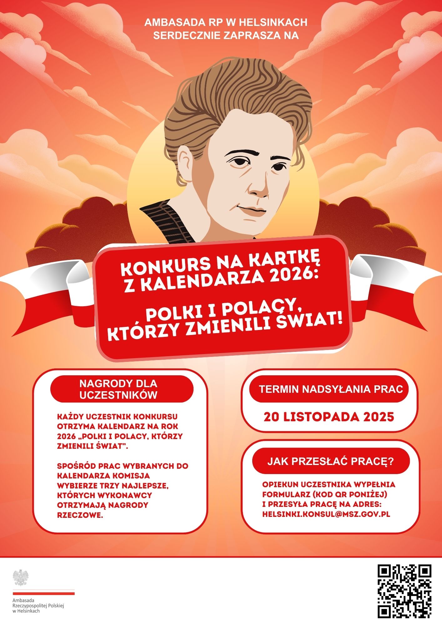 Prace można nadsyłać do 20 listopada 2025 r. na adres helsinki.konsul@msz.gov.pl po uprzedniej rejestracji za pomocą formularza zgłoszeniowego, który dostępny jest tutaj. Prosimy o zapoznanie się z załączonym regulaminem konkursu, który zawiera m. in. techniczne wymagania, które muszą spełniać prace konkursowe.