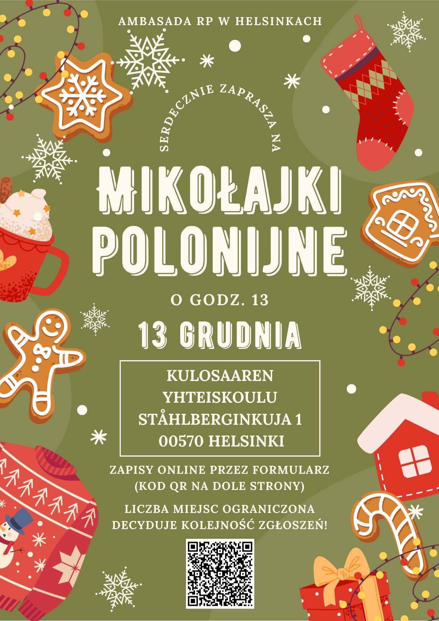 Ambasada Rzeczypospolitej Polskiej w Helsinkach serdecznie zaprasza na Mikołajki Polonijne! Z radością informujemy, że tegoroczne Mikołajki Polonijne odbędą się 13 grudnia 2025 roku (sobota) o godz. 13:00 w budynku Kulosaaren Yhteiskoulu, przy ul. Ståhlberginkuja 1 w Helsinkach.
