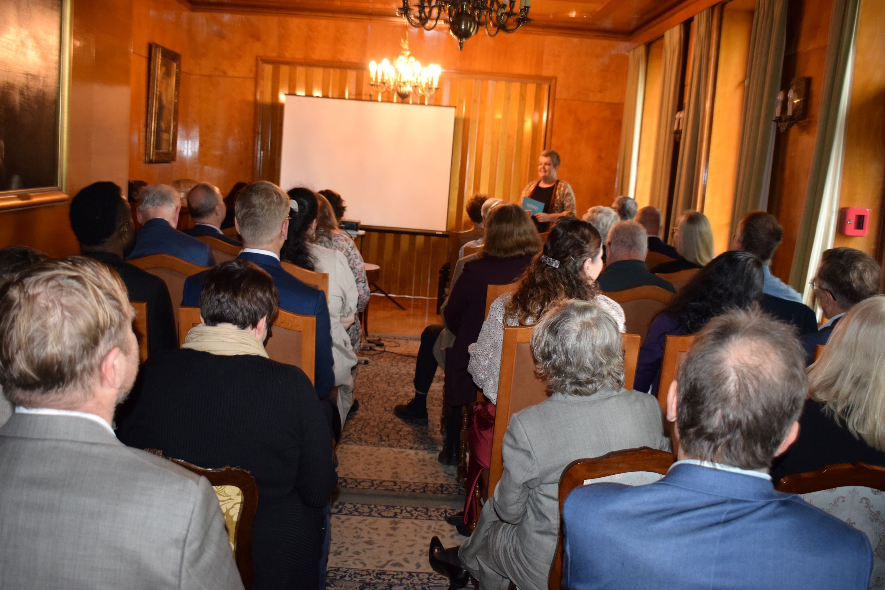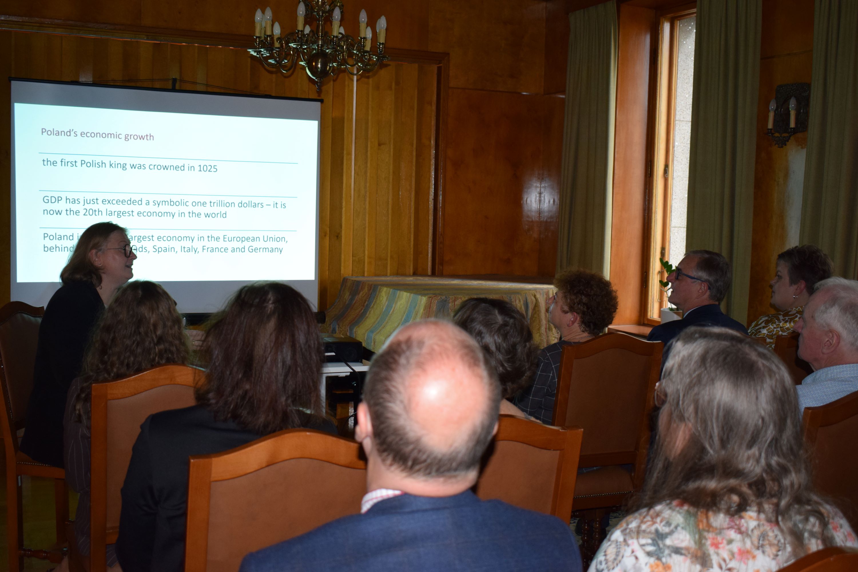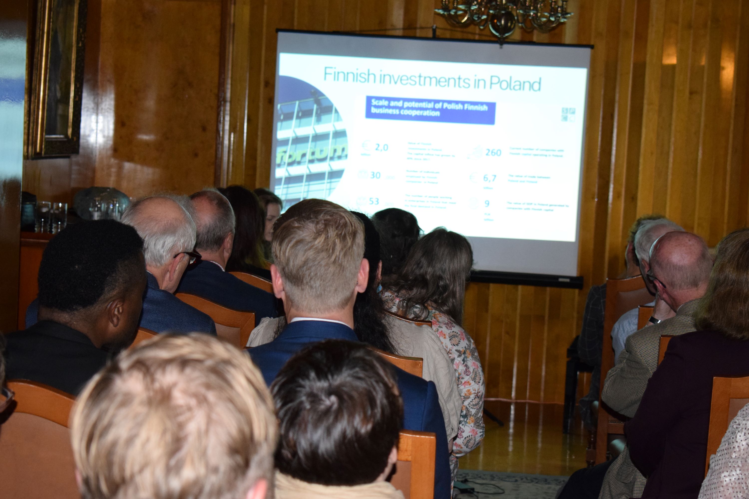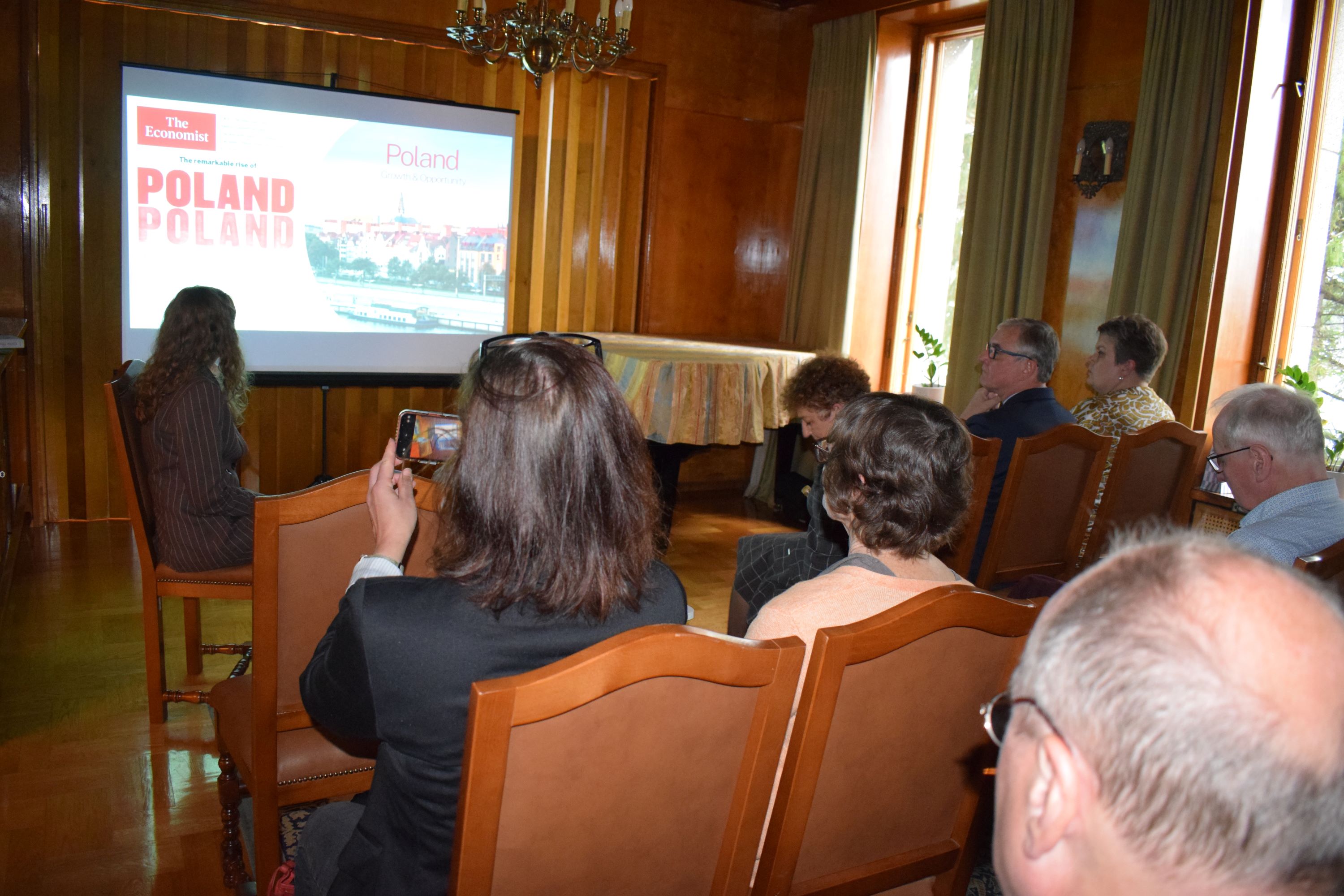 Dyrektor wykonawczy Ekonomföreningen Niord (www.niord.fi) Jenny Pihlström-Odrobinski zgromadziła w rezydencji liczną grupę zainteresowanych członków Stowarzyszenia, którzy mieli okazję do udziału w ciekawej dyskusji z szefem placówki, panem Tomaszem Chłoniem oraz do wysłuchania trzech interesujących prezentacji. Pani Patrycja Saxlund, Kierownik Biura Polskiej Agencji Inwestycji i Handlu w Helsinkach opowiedziała o dynamicznie rozwijającej się wymianie handlowej pomiędzy Polską a Finlandią, najważniejszych polskich inwestycjach w Finlandii oraz sukcesach polskich przedsiębiorców. Pani Izabela Furmaniak z Amb. RP w Helsinkach zaprezentowała aktualny krajobraz gospodarczy Polski, możliwości inwestycyjne dla fińskich przedsiębiorców oraz perspektywy rozwoju polskiej gospodarki. Dyrektor Polskiej Organizacji Turystycznej z siedzibą w Sztokholmie, pani Małgorzata Hudyma, przedstawiła ciekawą prezentację o walorach polskich destynacji turystycznych.