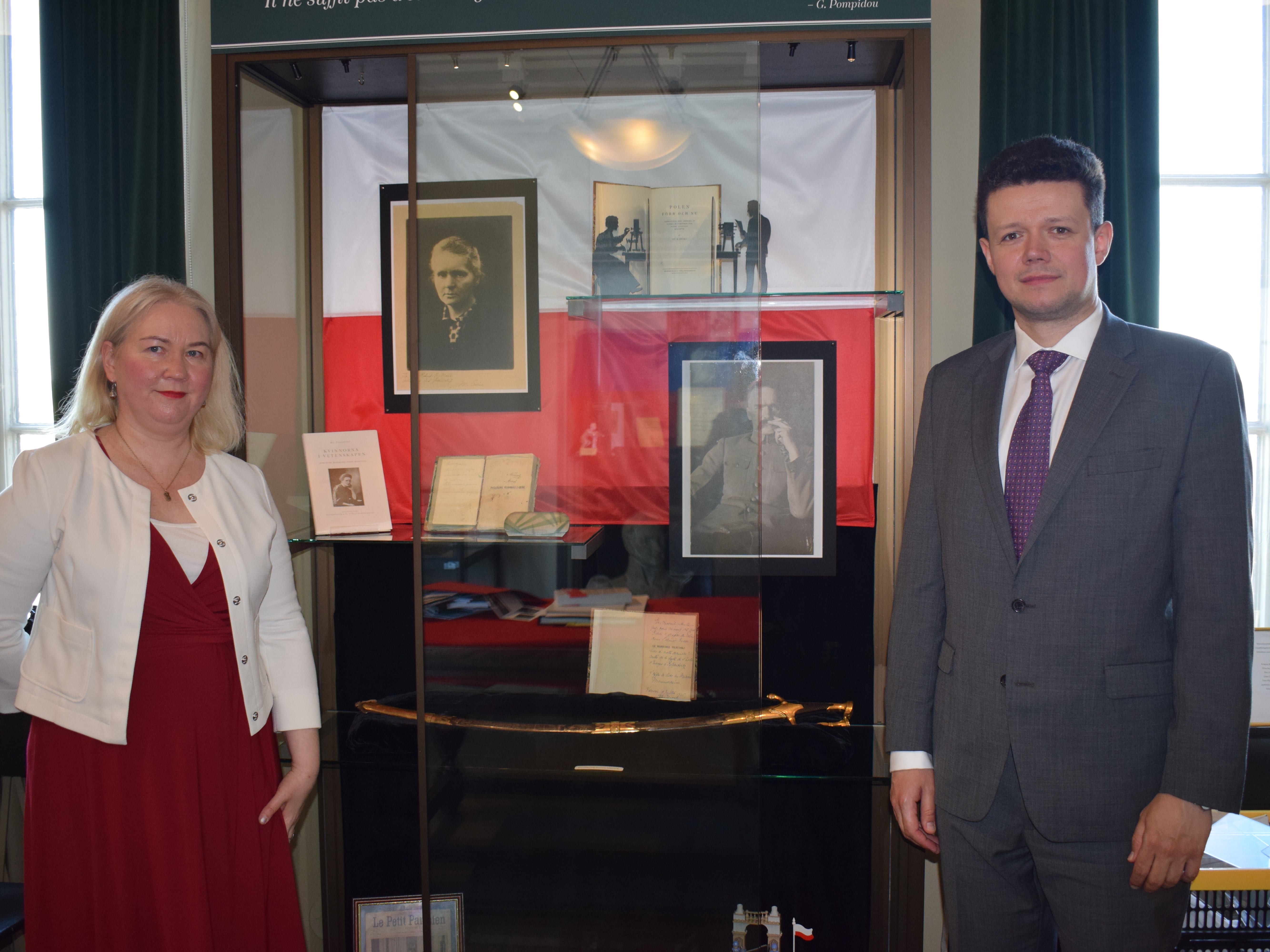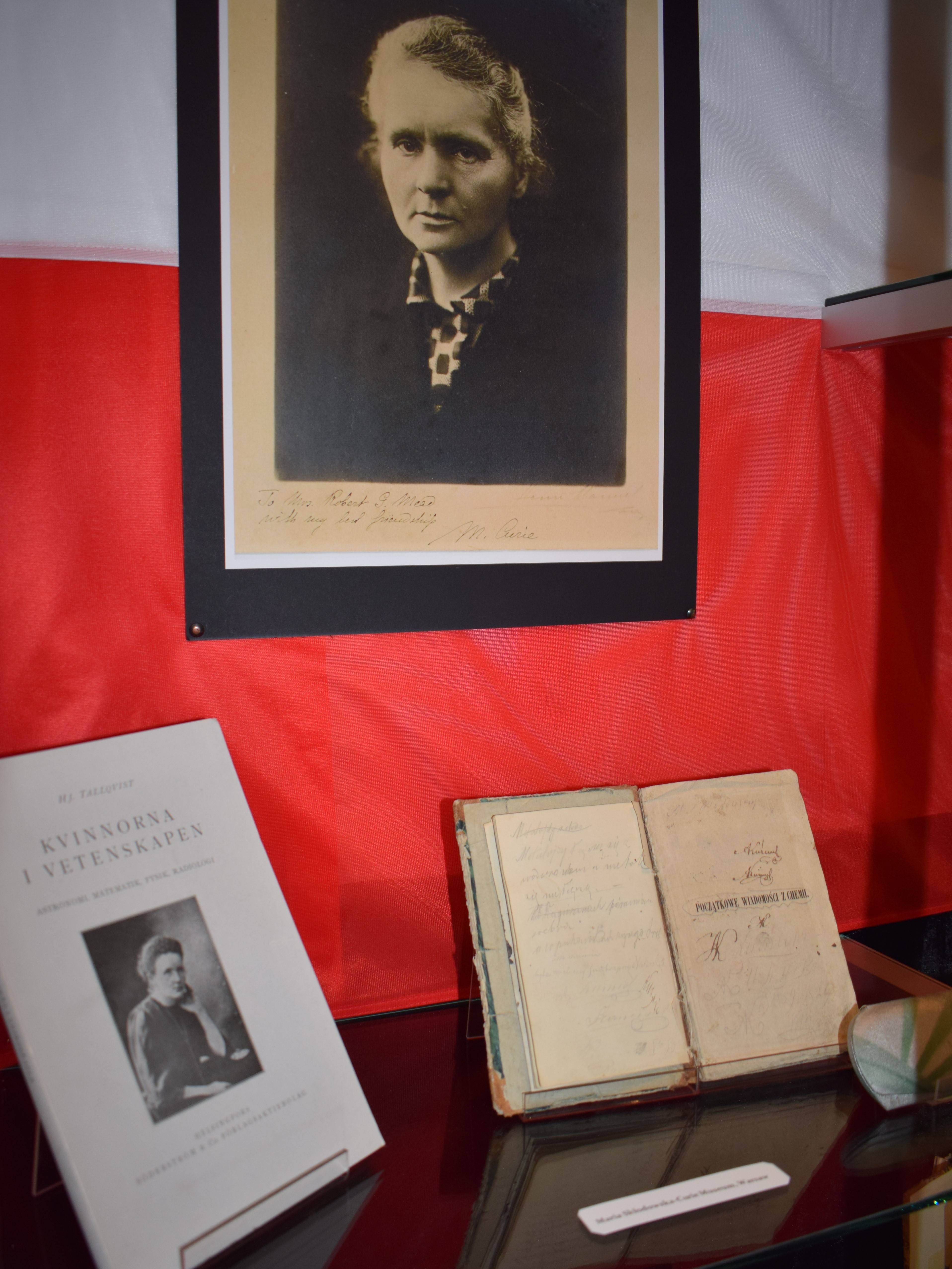 Ekspozycję zdobi także reprodukcja fotografii Marii Skłodowskiej-Curie z 1921 roku. Zdjęcie zostało wykonane przez cenionego francuskiego fotografa – Henriego Manuela – specjalizującego się ujęciach portretowych, który kilkukrotnie uwiecznił noblistkę w trakcie jej kariery, był także oficjalnym fotografem rządu francuskiego. Słynąca ze skromności Maria Skłodowska-Curie nie rozdawała autografów, stąd wyjątkowa wartość tego przedmiotu. Pochodzące ze zbiorów Muzeum Marii Skłodowskiej-Curie zdjęcie zostało zadedykowane Elsie Mead, członkini Funduszu Radowego im. Marii Curie, przyjaciółce i współorganizatorce wizyt uczonej w USA.