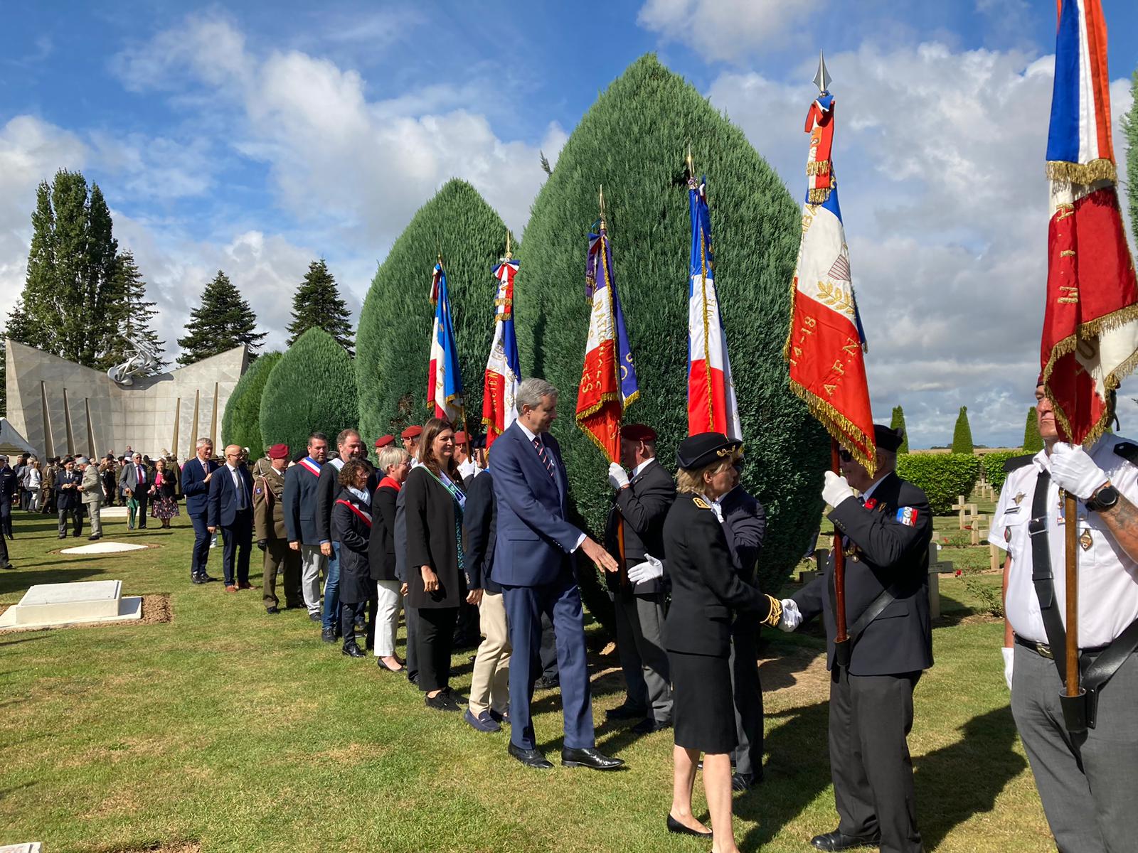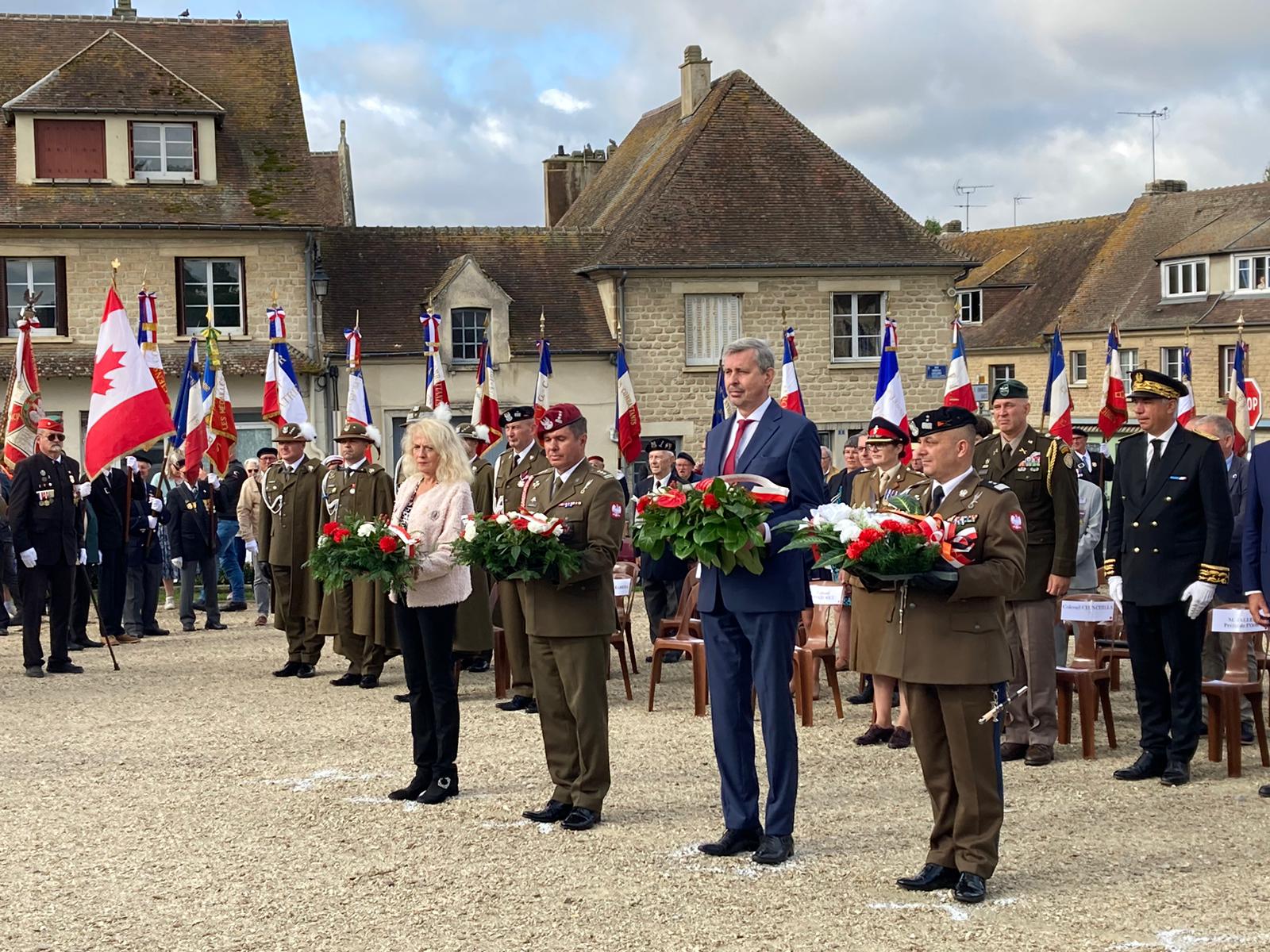 Au cours de la cérémonie, des représentants des autorités et des milieux d'anciens combattants ont déposé des gerbes au pied du monument du général Stanislaw Maczek et devant la plaque principale du Mémorial de Montormel.
