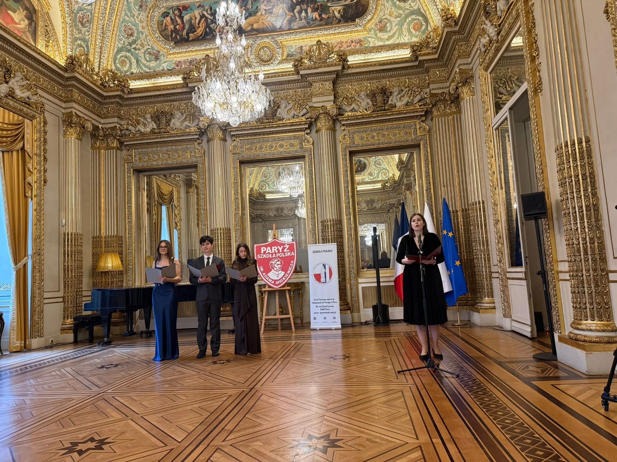 Les invités ont été accueillis à l’Ambassade par la Consule de la République de Pologne à Paris, Mme Agnieszka Kozińska-Makowska, entourée des vice-consuls Mme Patrycja Marcinkowska, Mme Iga Gajos et M. Seweryn Góralczyk. Cette soirée a rassemblé des représentants des autorités locales et de la communauté éducative (M. Jean-Didier Berthault, conseiller du XVIIe arrondissement de Paris, M. Konrad Leszczyński, directeur de l’École polonaise Adam Mickiewicz auprès de l’Ambassade de la République de Pologne à Paris ; Mme Monika Korchel, directrice de l’École polonaise Sainte-Geneviève auprès de l’Ambassade de la République de Pologne à Paris ; M. Philippe Bonneville, directeur du Lycée international de Saint-Germain-en-Laye, ainsi que Mme Agnieszka Sygowska-Kalmus, responsable de la Section polonaise ; M. Max Aubernon, directeur du Lycée Montaigne, Mme Danuta Charlon, responsable de la Section polonaise, et Mme Marlena Miś-Grenon, EIE ; Mme Nathalie Bader, directrice de l’École primaire Maria Curie, et Mme Khadija Trouiller, directrice du Collège Les Hauts Grillets), ainsi que de nombreux enseignants, parents et les élèves de terminale de cette année.