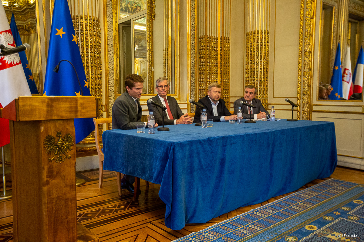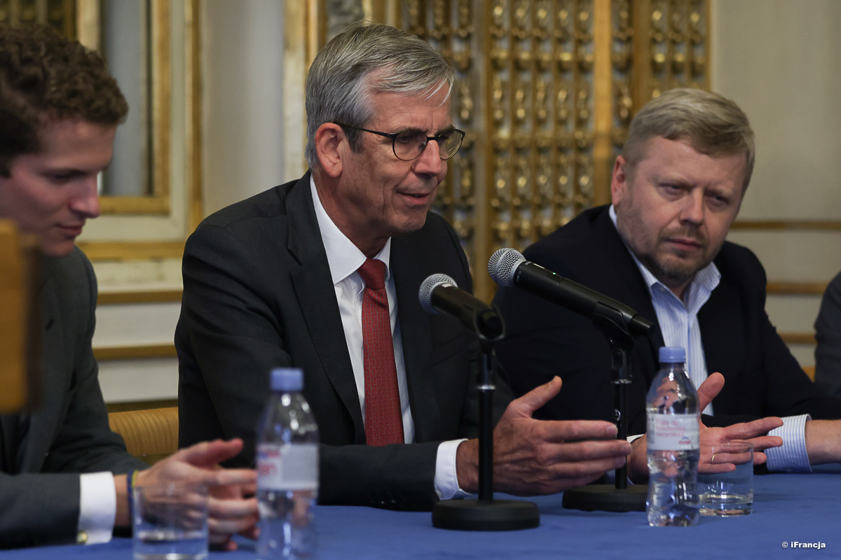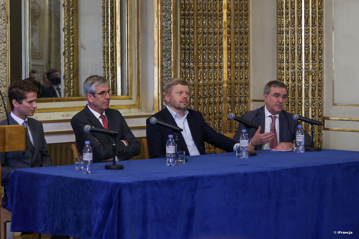 Les intervenants de la table ronde, Monsieur Christian Théry, chef d’entreprise STARD, Monsieur Maciej Witucki, Président de la Confédération d’entrepreneurs polonais Lewiatan ainsi que Monsieur Kajetan Rosciszewski, Directeur du bureau parisien de la PAIH, modérée par Monsieur Olivier de Boysson, chef économiste des pays émergents au sein de la Société Générale, ont échangé leurs points de vue sur la coopération économique bilatérale, le nouveaux opportunités d’investissement en Pologne et les partenariats dans le cadre des projets européens, y compris pour l'Autonomie Stratégique de l’UE.