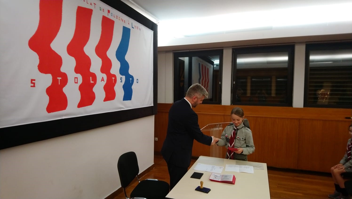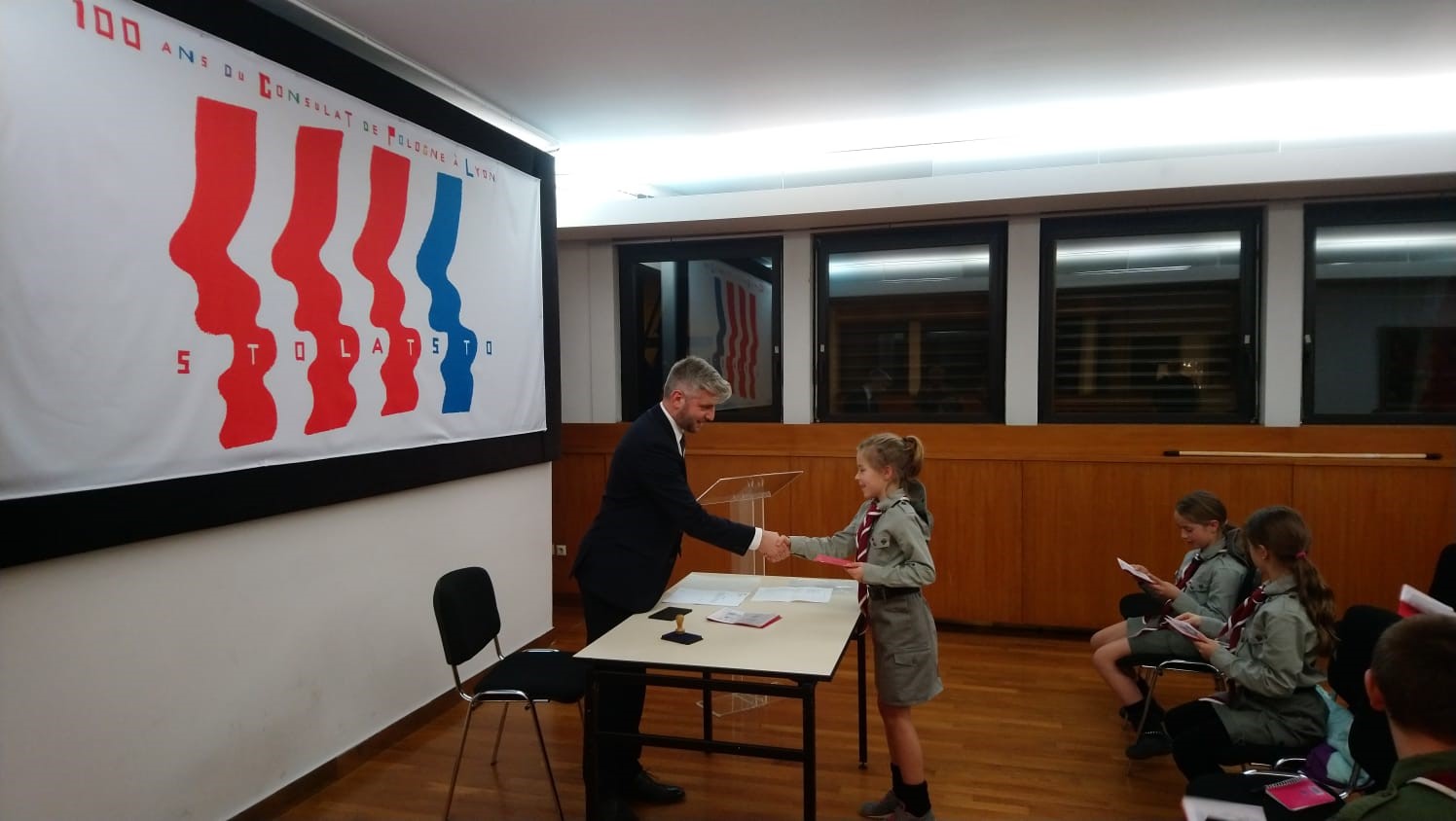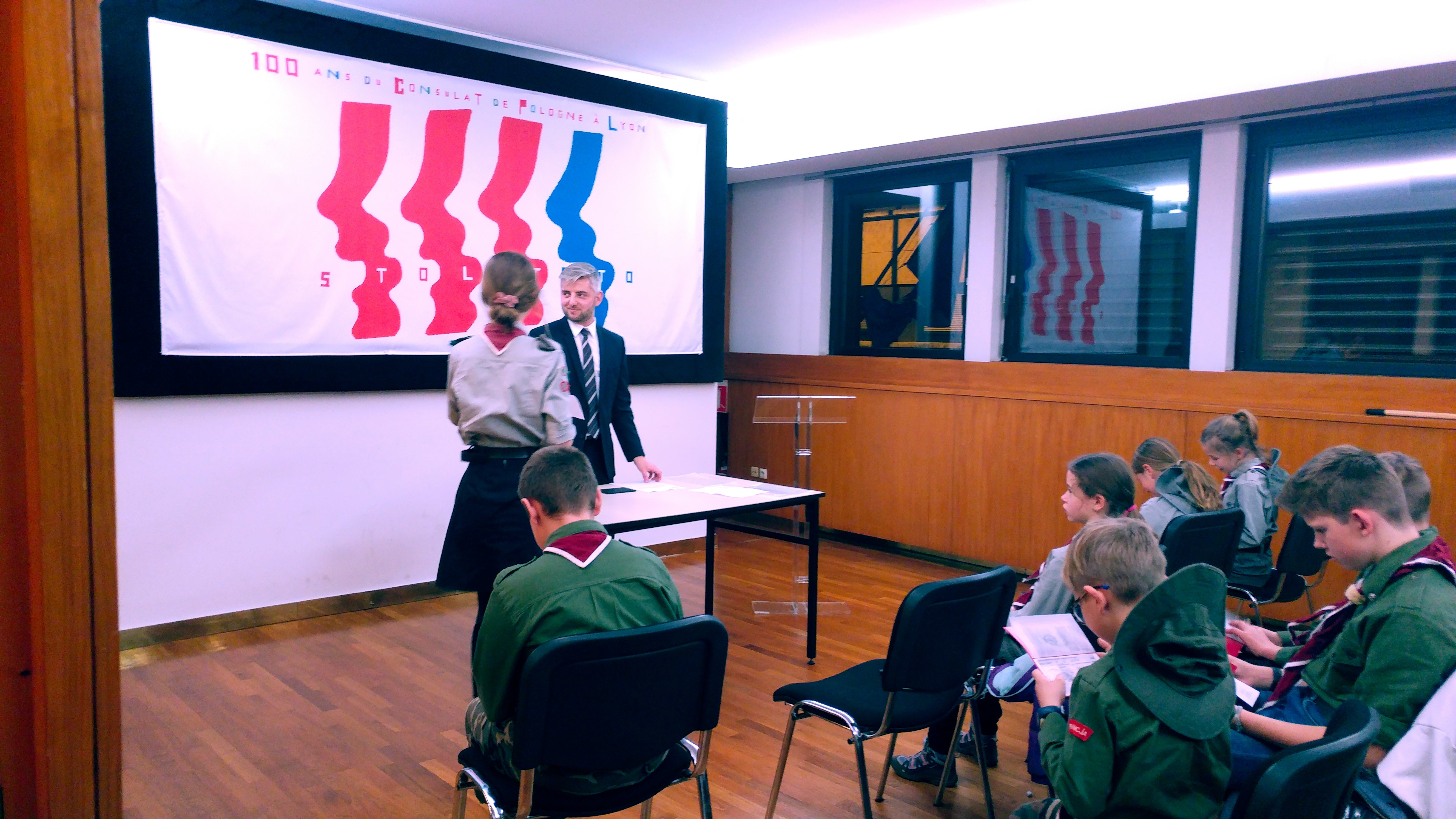 Samedi soir les invités ont participé à la rencontre autour du travail consulaire sous le slogan « 100 ans de Consulat de Pologne à Lyon ». Pendant la première partie de cette rencontre, les jeunes ont pu découvrir les fonctions consulaires exercées par les postes consulaires (le rôle des consulats, circonscriptions consulaires) et diverses taches consulaires (passeports, citoyenneté, état civil, assistance consulaire, organisation des élections). La prestation, suivi d’un atelier animé par le Vice-consul, a été très appréciée par les participants, qui, à l’issue de l’atelier, ont reçu « les passeports des scouts polonais » ainsi que les attestation de participation à la formation. Lors de la deuxième partie de la rencontre, une formation en protocole diplomatique a été dispensée par Mme la Consule Générale sous forme d’une simulation de la célébration de la Fête Nationale de Pologne et des «100 ans de Consulat de Pologne à Lyon». Au prélude, Mme la Consule a expliqué les aspects diplomatiques et protocolaires des réceptions officielles données au consulat. Les participants ont pu jouer le rôle des hôtes (fonctionnaires consulaires), des invités et du personnel de service technique. Les invitations ont été vérifiées, les hymnes chantés et les discours officiels et les félicitations à l’occasion du centenaire du consulat ont eu lieu. A la fin de la soirée, les scouts et leurs invités du consulat se sont retrouvés autour du feu des bougies, pour chanter ensemble au son des guitares et pour échanger sur l’importance de la tradition polonaise et de l’identité culturelle.