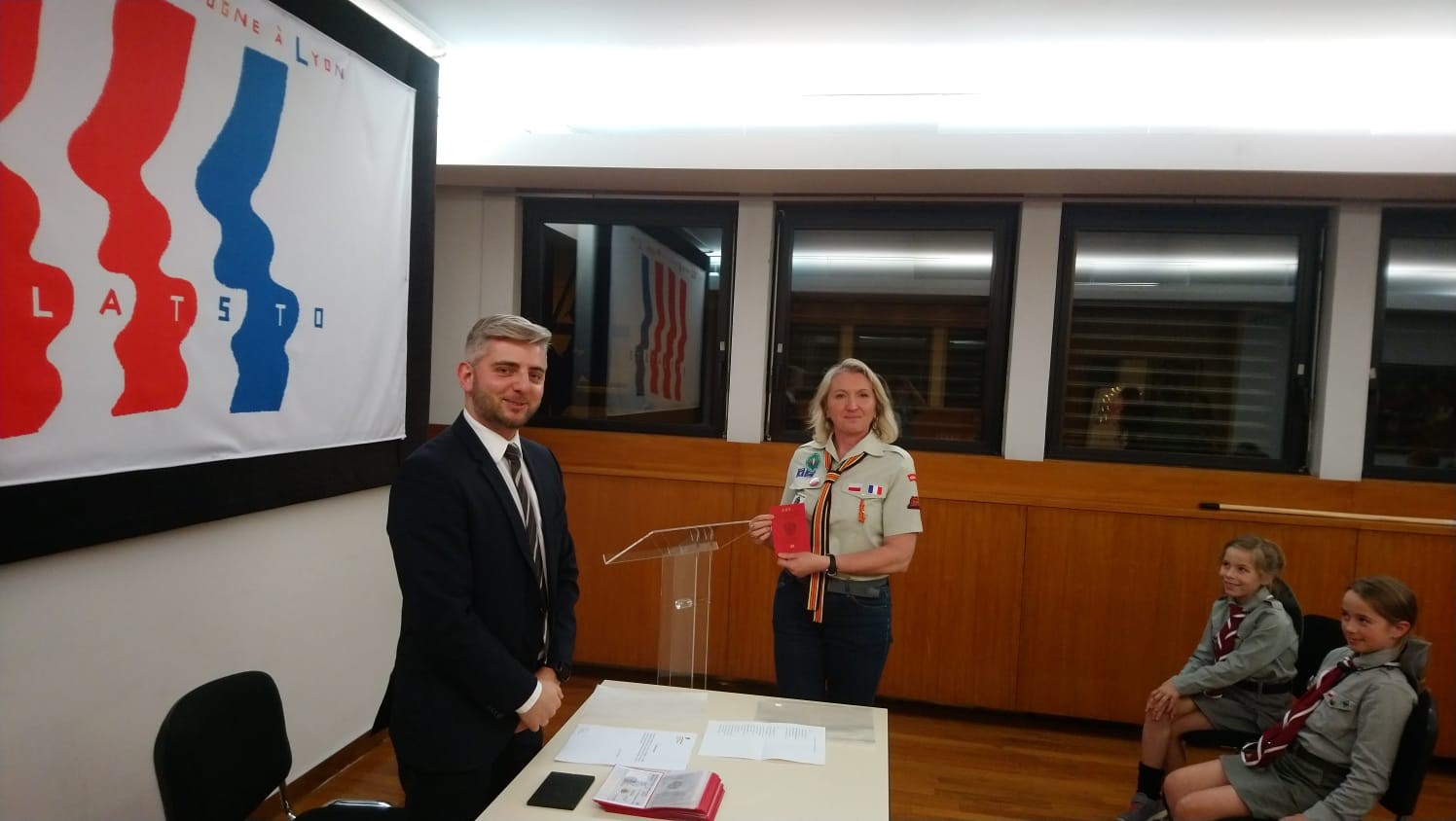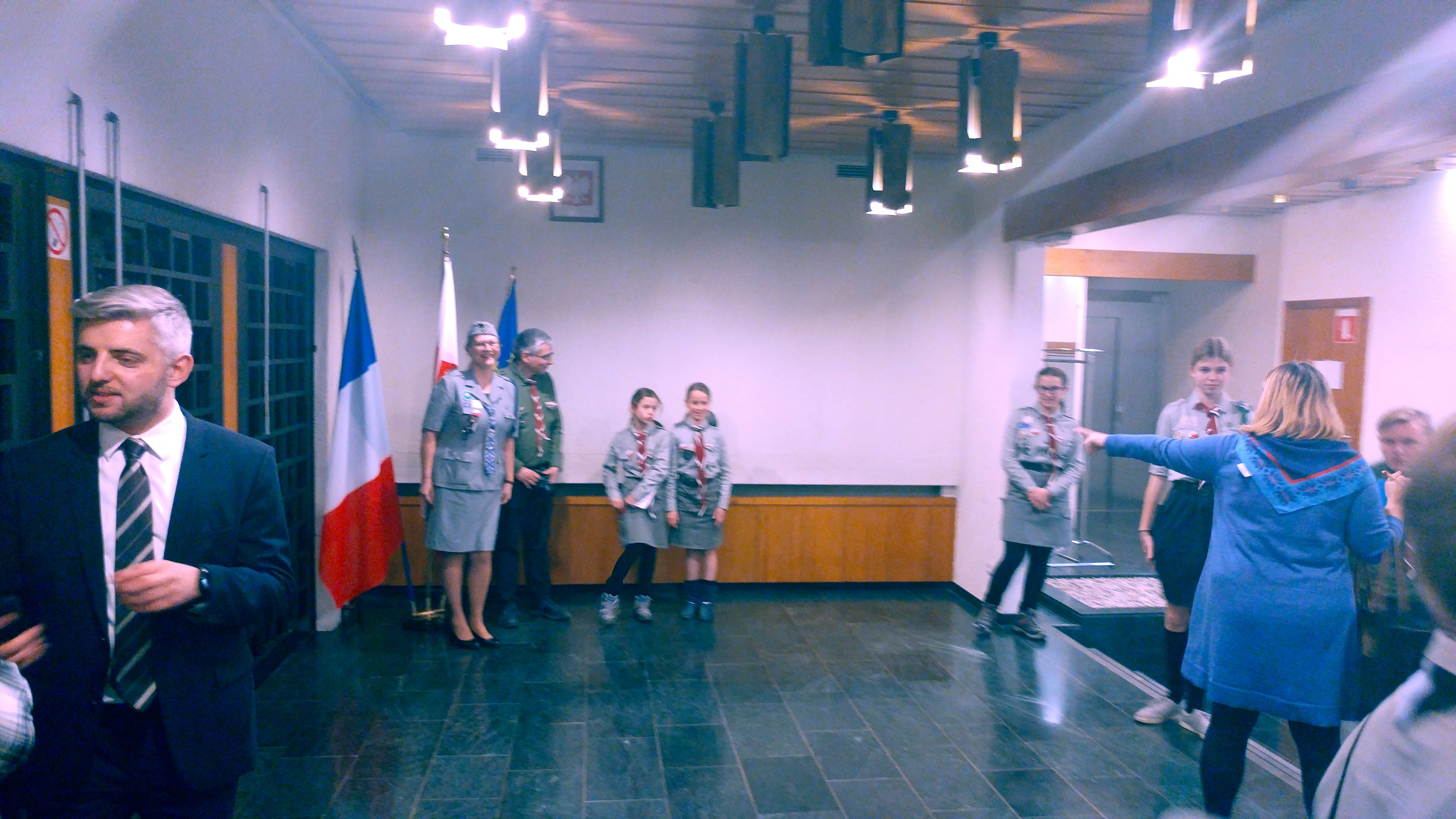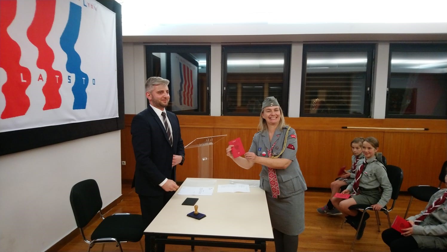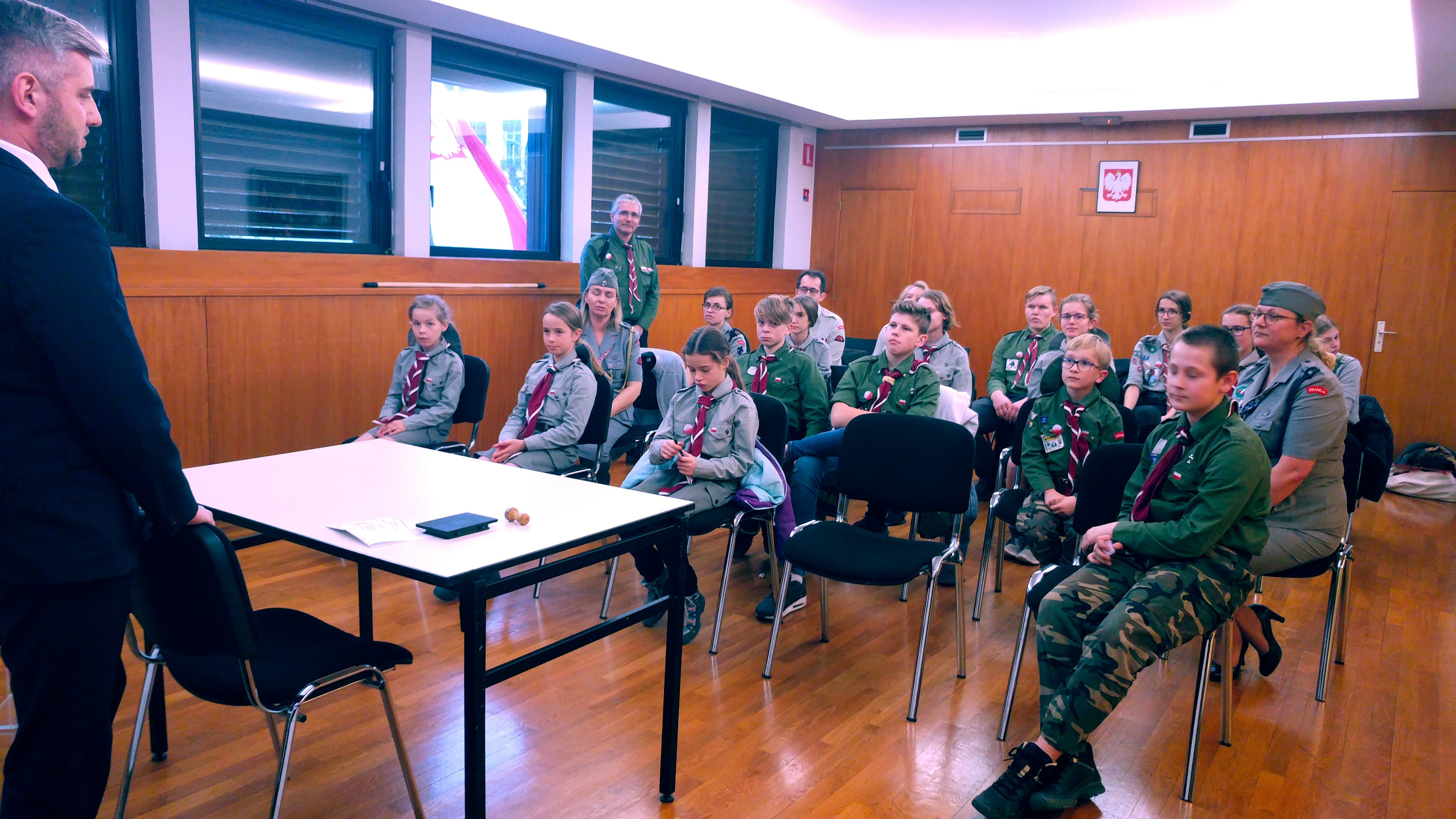 Samedi soir les invités ont participé à la rencontre autour du travail consulaire sous le slogan « 100 ans de Consulat de Pologne à Lyon ». Pendant la première partie de cette rencontre, les jeunes ont pu découvrir les fonctions consulaires exercées par les postes consulaires (le rôle des consulats, circonscriptions consulaires) et diverses taches consulaires (passeports, citoyenneté, état civil, assistance consulaire, organisation des élections). La prestation, suivi d’un atelier animé par le Vice-consul, a été très appréciée par les participants, qui, à l’issue de l’atelier, ont reçu « les passeports des scouts polonais » ainsi que les attestation de participation à la formation. Lors de la deuxième partie de la rencontre, une formation en protocole diplomatique a été dispensée par Mme la Consule Générale sous forme d’une simulation de la célébration de la Fête Nationale de Pologne et des «100 ans de Consulat de Pologne à Lyon». Au prélude, Mme la Consule a expliqué les aspects diplomatiques et protocolaires des réceptions officielles données au consulat. Les participants ont pu jouer le rôle des hôtes (fonctionnaires consulaires), des invités et du personnel de service technique. Les invitations ont été vérifiées, les hymnes chantés et les discours officiels et les félicitations à l’occasion du centenaire du consulat ont eu lieu. A la fin de la soirée, les scouts et leurs invités du consulat se sont retrouvés autour du feu des bougies, pour chanter ensemble au son des guitares et pour échanger sur l’importance de la tradition polonaise et de l’identité culturelle.