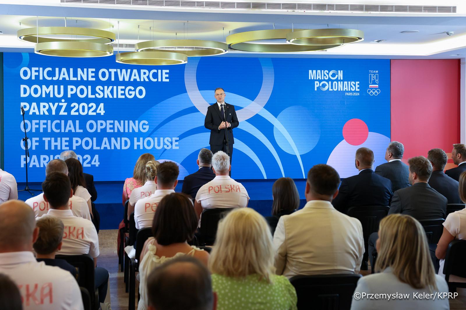 Dans la matinée du vendredi 26 juillet, le Président de la République de Pologne a assisté à l'ouverture de la Maison Polonaise, destinée à accueillir les athlètes, les représentants des médias et les supporteurs. Il a également participé à la prestation de serment des athlètes polonais, auxquels il a remis les nominations olympiques. Dans son discours, le Président a rappelé que l'équipe nationale polonaise a participé pour la première fois aux Jeux olympiques modernes il y a exactement cent ans, en 1924. À l'époque, les Jeux Olympiques se déroulaient également en France. Il a souligné que jusqu'à présent, les Polonais ont remporté 298 médailles aux Jeux Olympiques d'été et a exprimé l'espoir qu'au cours de la compétition de cette année, l'équipe polonaise dépassera largement la barre des trois cents médailles.