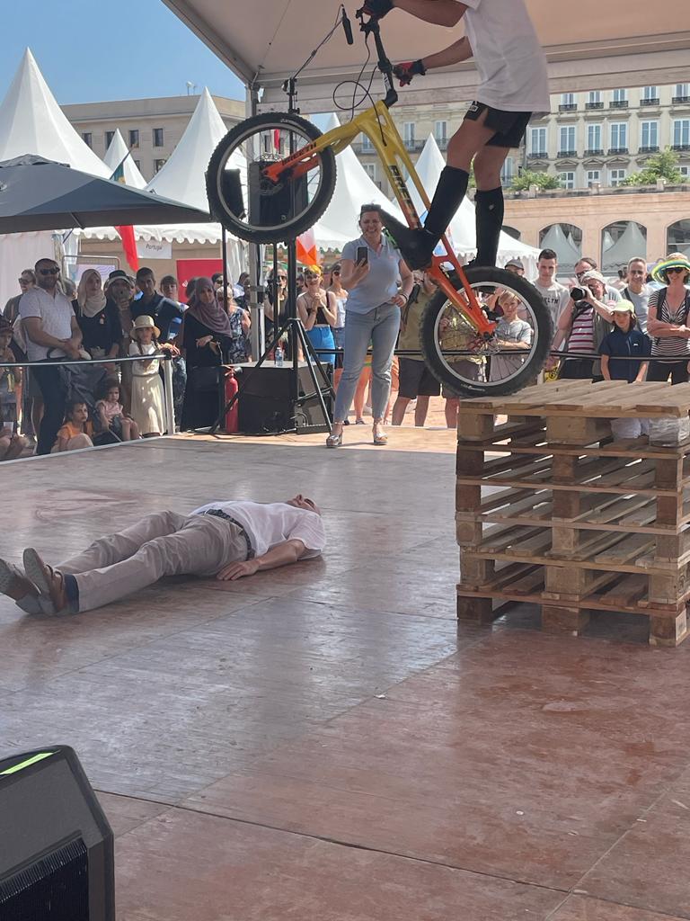 Punktem kulminacyjnym obecności wadowickich zawodników był pokaz akrobacji rowerowych, który odbył się w sobotę 03.06 na głównej scenie przygotowanej przez organizatorów. Polska była jedynym krajem, który zaprezentował widowisko z wykorzystaniem rowerów. Talent naszych sportowców został doceniony przez Mera m. Lyonu oraz przedstawicieli władz miejscowych, ale nade wszystko został entuzjastycznie przyjęty przez licznie przybyłą publiczność. Pokaz wykonali Mikołaj Woźniak, Wicemistrz Świata z 2022 roku w trialu oraz Sebastian Chlipała, Wicemistrz Polski z 2022 roku - obaj w swoich kategoriach wiekowych.
