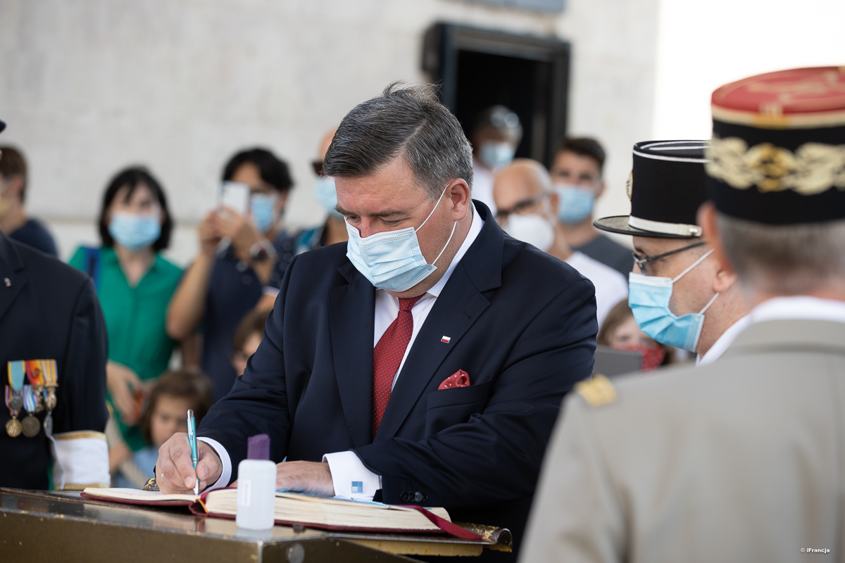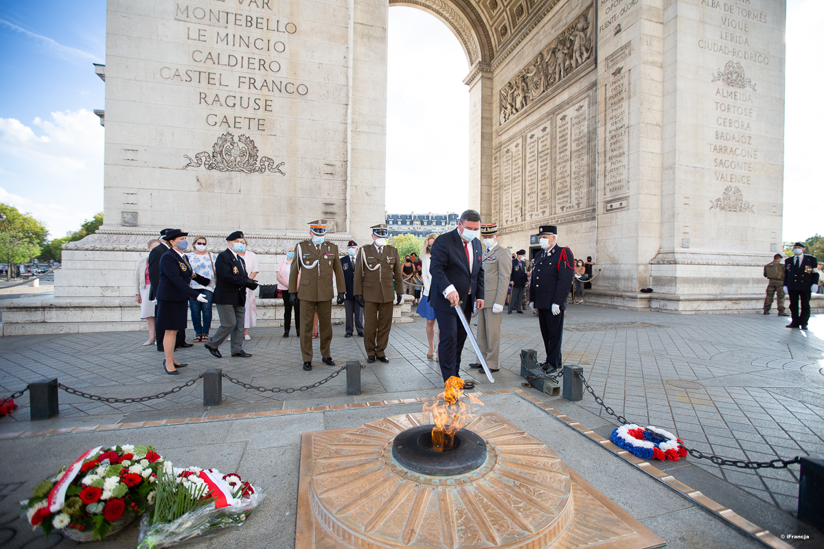 Po południu Ambasador złożył wieniec na Grobie Nieznanego Żołnierza pod Łukiem Triumfalnym w Paryżu oraz wziął udział w ceremonii ożywienia płomienia. W uroczystości wzięli również udział płk Marek Kurkowicz, wicekonsul Anna Majda, prezes Stowarzyszenia Polskich Kombatantów we Francji Florian de Załuski oraz członkowie Comité de la Flamme z generałem brygady Paul Moreau na czele. Podczas ceremonii odśpiewano hymny Rzeczypospolitej Polskiej i Republiki Francuskiej.