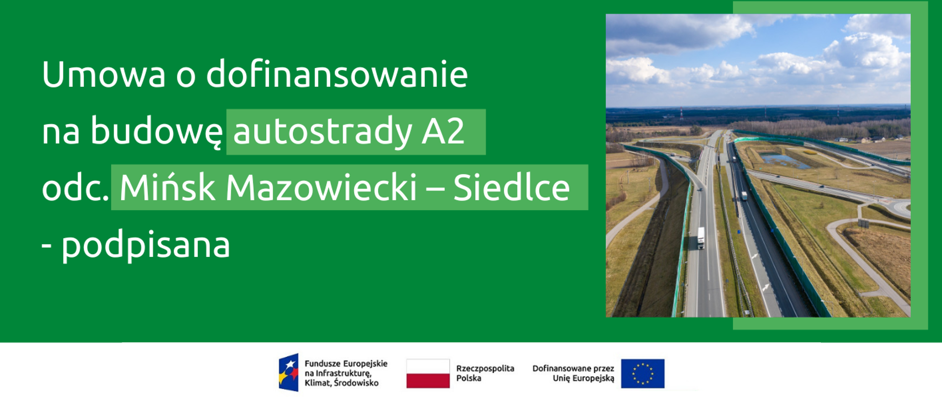 25 kwietnia podpisano umowę na dofinansowanie projektu „Budowa autostrady A2, odc. Mińsk Mazowiecki – Siedlce Faza II ”. Inwestycja przyczyni się do zwiększenia bezpieczeństwa i skrócenia czasu podróży, zmniejszenia ryzyka wypadków, a także ograniczenia emisji spalin i hałasu w rejonie województwa mazowieckiego.