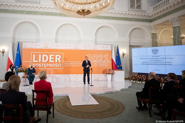 Dziś nagradzamy tych, którzy w szczególny sposób dbają o osoby z niepełnosprawnościami. Likwidujecie bariery architektoniczne i udowadniacie, że parki, hotele, metro, muzea, czy przedszkola mogą i powinny być w równym stopniu dostępne dla wszystkich – powiedziała wiceminister funduszy i polityki regionalnej Małgorzata Jarosińska-Jedynak podczas gali finałowej VI edycji konkursu „Lider Dostępności”. Uroczystość odbyła się 13 października 2021 r. w Pałacu Prezydenckim.