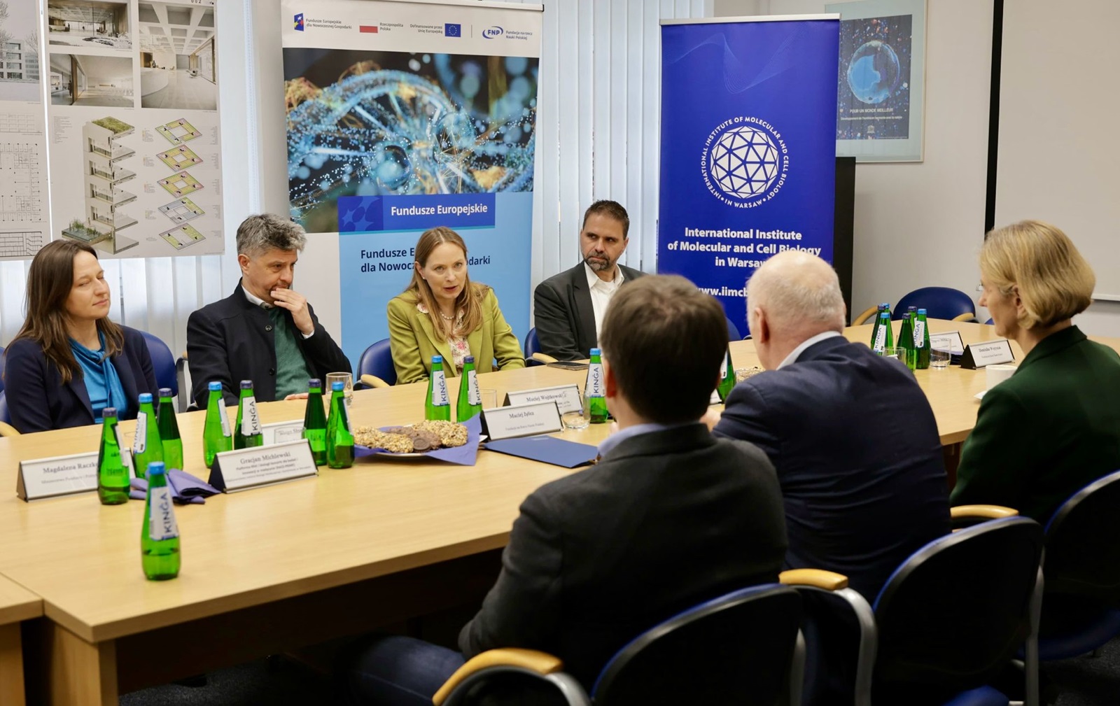 Spotkanie w MIBMiK z minister K. Pełczyńską-Nałęcz było okazją do rozmowy o wsparciu dla ośrodków naukowych z Funduszy Europejskich. W spotkaniu udział wzięli dyrektor Instytutu prof. Marta Miączyńska, dyrektor Międzynarodowego Centrum Badań Oka ICTER prof. Maciej Wojtkowski, przedstawiciele Fundacji na rzecz Nauki Polskiej, a także liderzy jednostek badawczych.