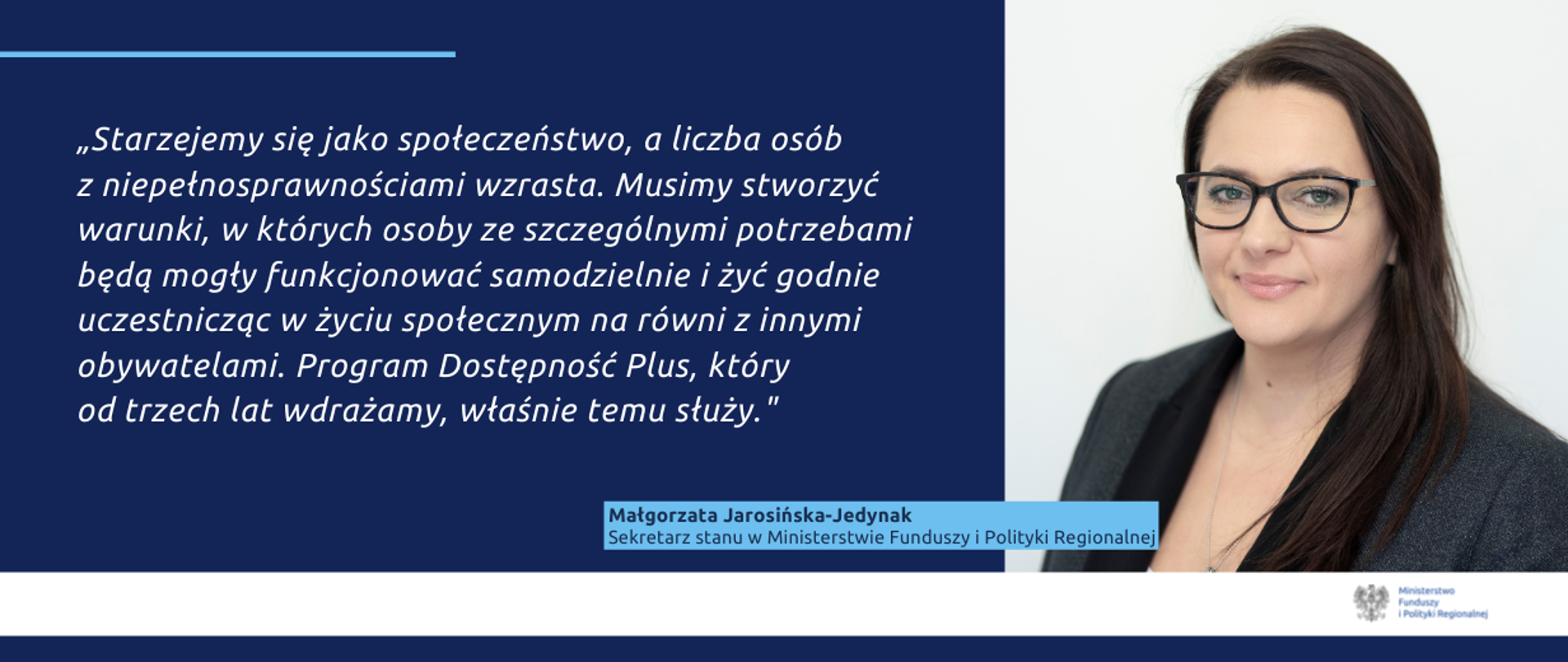 Starzejemy się jako społeczeństwo, a liczba osób z niepełnosprawnościami wzrasta. Musimy stworzyć warunki, w których osoby ze szczególnymi potrzebami będą mogły funkcjonować samodzielnie i żyć godnie uczestnicząc w życiu społecznym na równi z innymi obywatelami. Program Dostępność Plus, który od trzech lat wdrażamy, właśnie temu służy