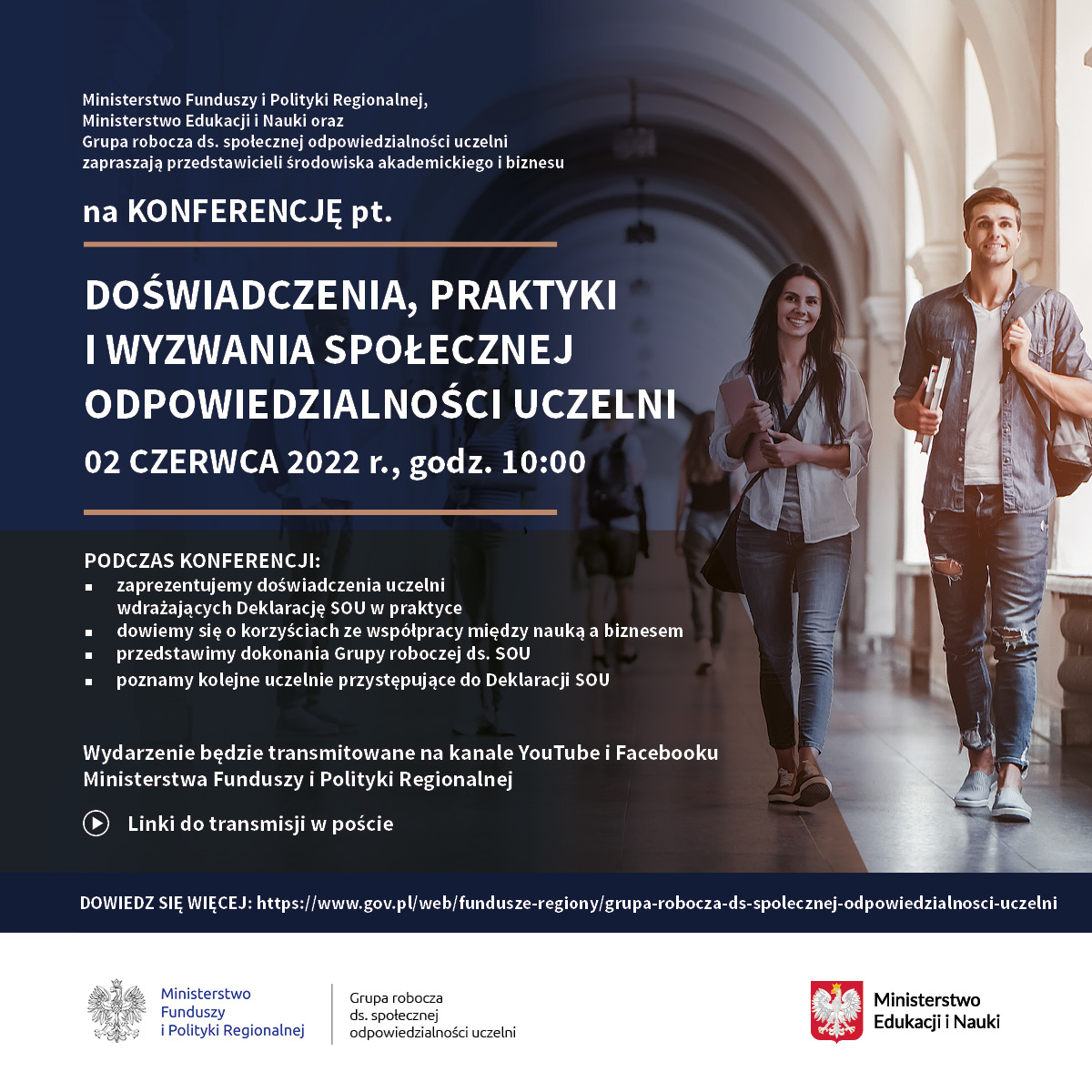 2 czerwca 2022 r. w Ministerstwie Funduszy i Polityki Regionalnej odbyła się konferencja pod hasłem „Doświadczenia, praktyki i wyzwania społecznej odpowiedzialności uczelni”.