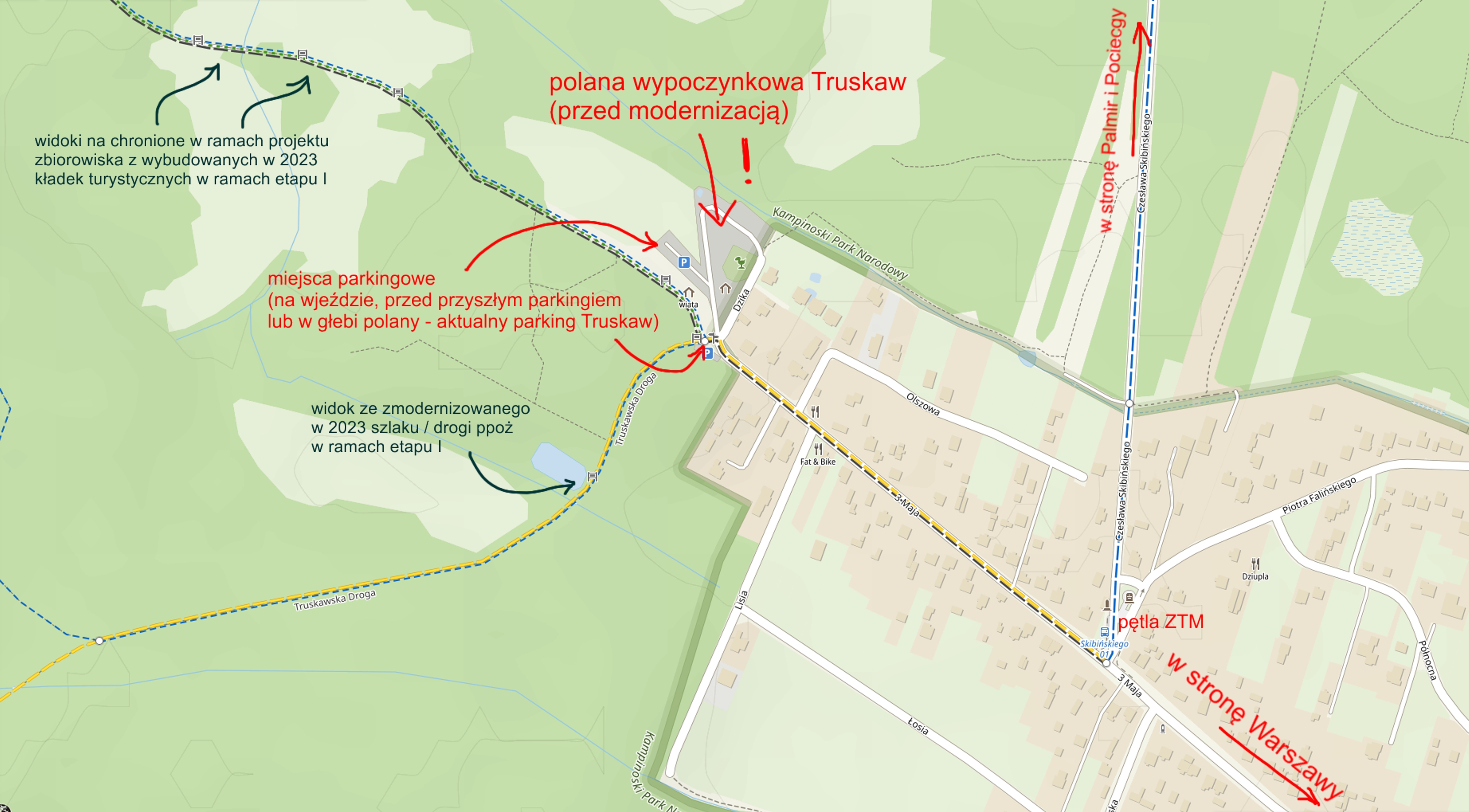 GDZIE: Wieś Truskaw w gminie Izabelin. W załączonych mapkach podajemy schemat dojazdu do polany wypoczynkowej i parkingu Truskaw w Kampinoskim Parku Narodowym i lokalizację miejsca konferencji na Google Maps: https://maps.app.goo.gl/Ha1JqKnfF2TairzSA