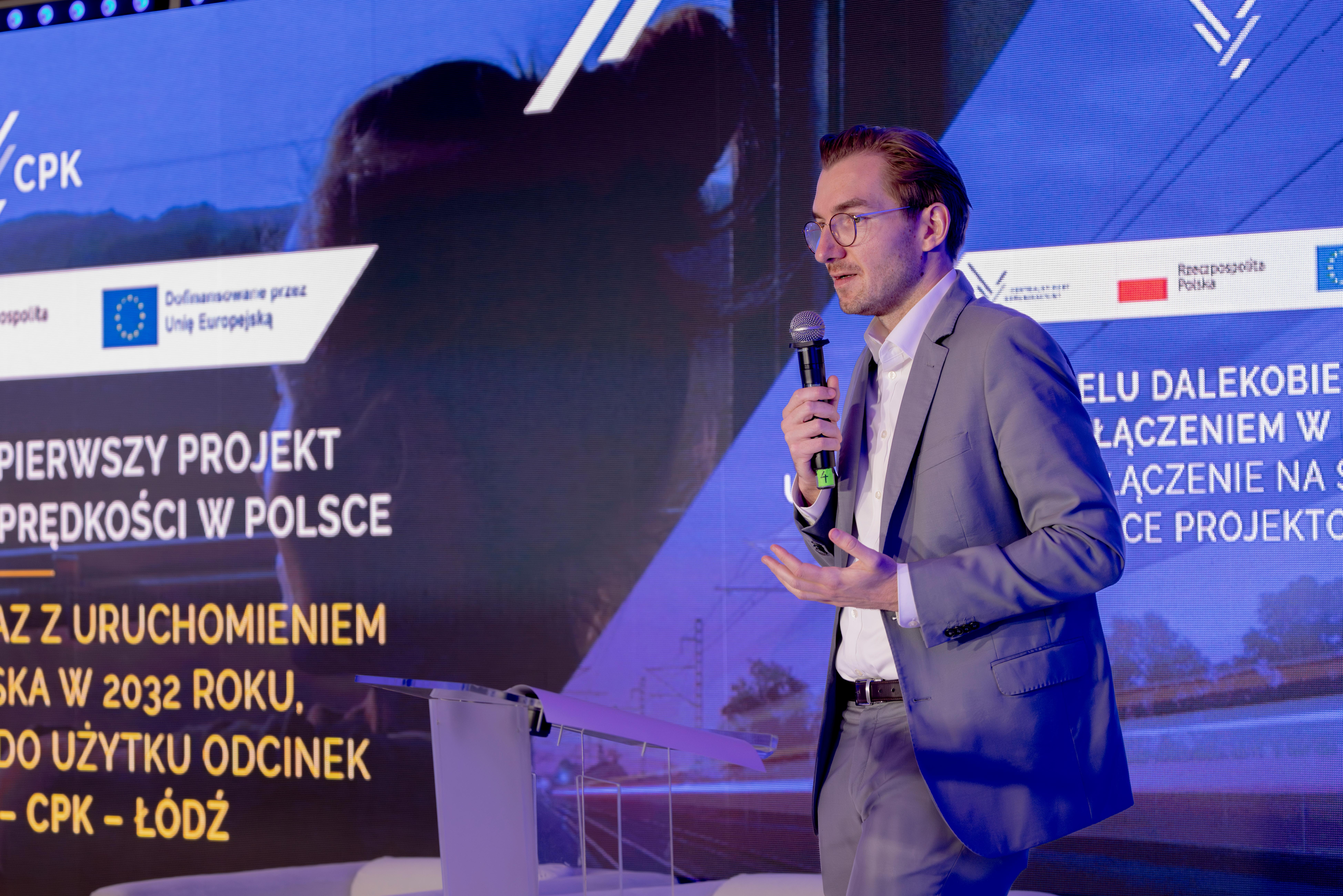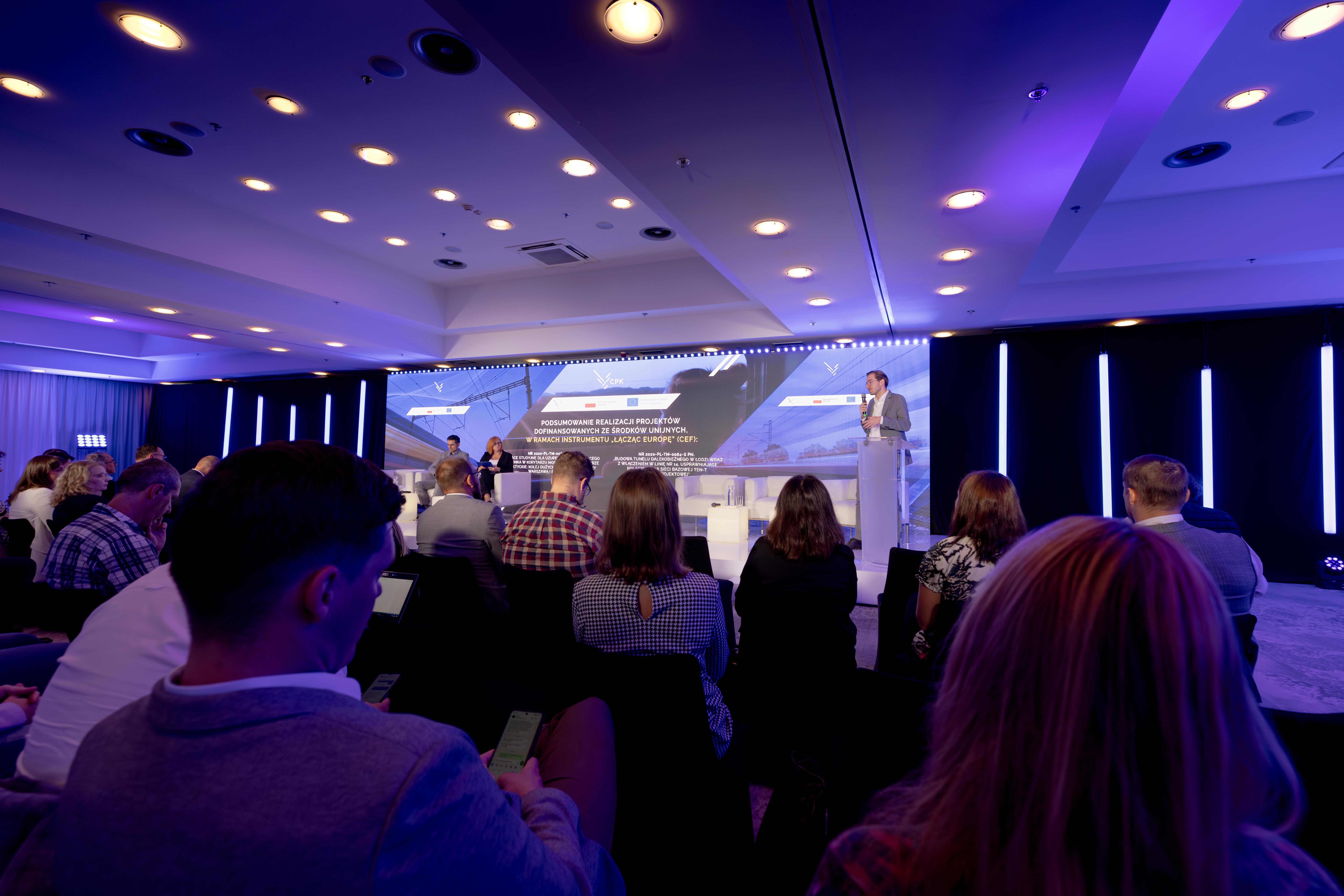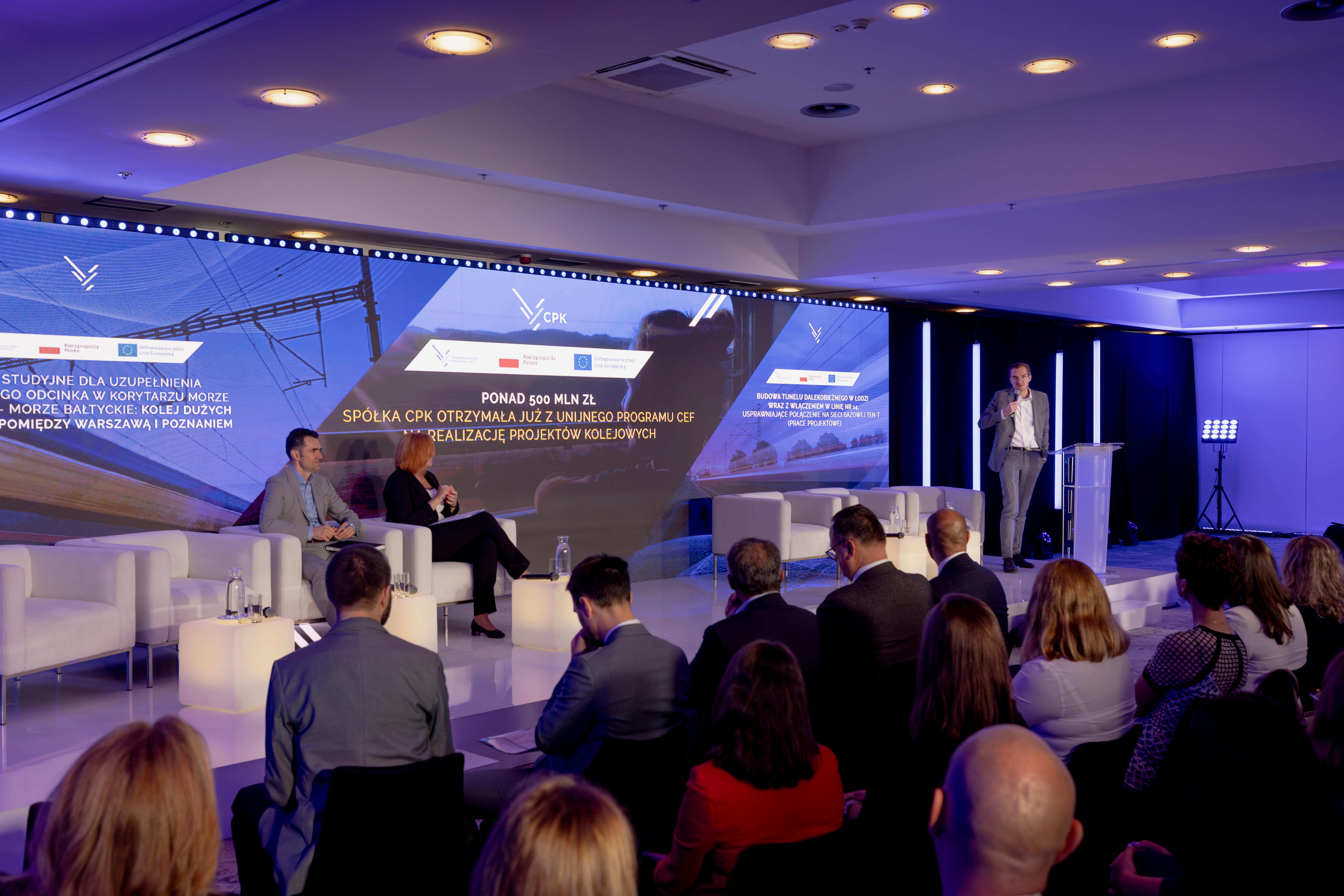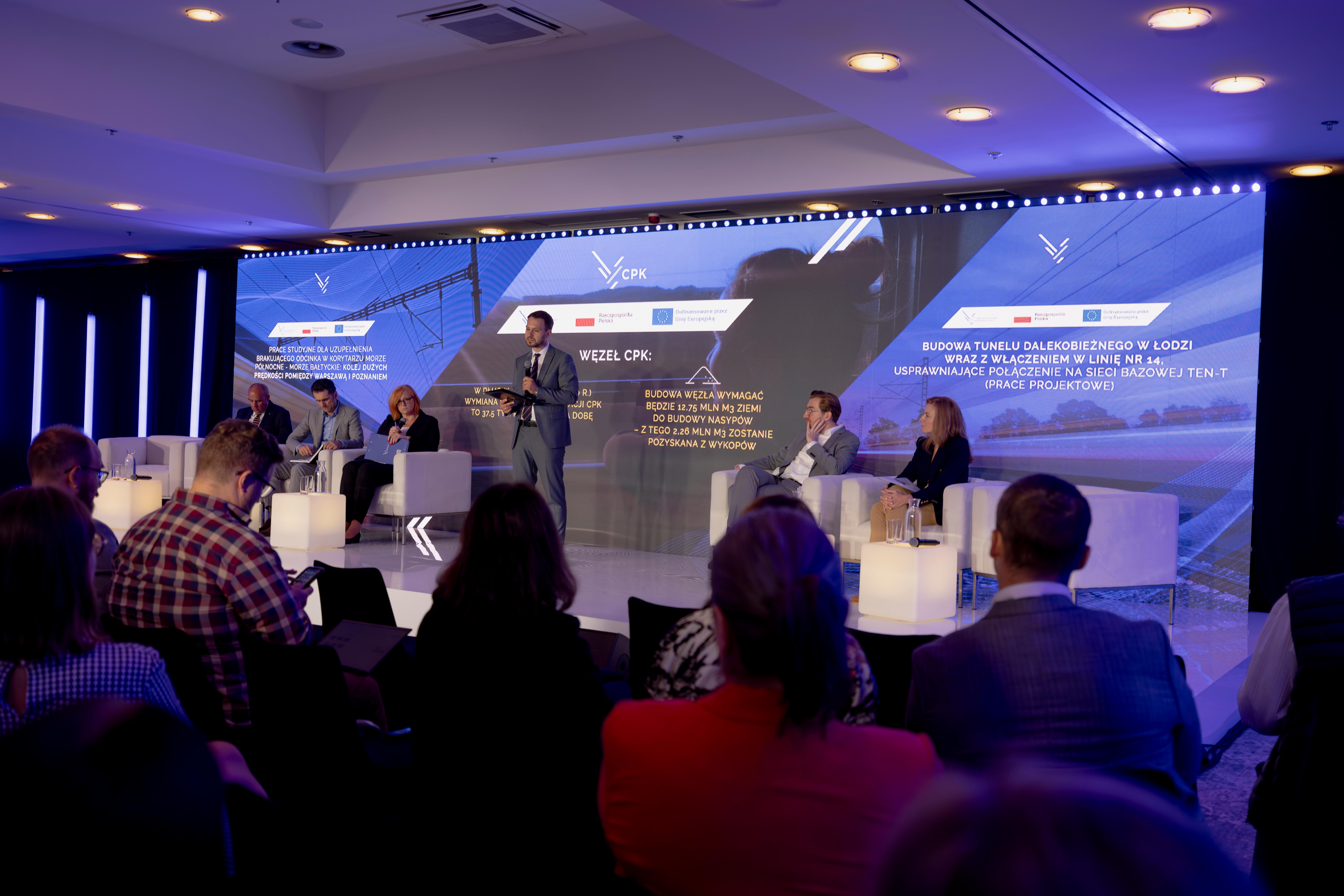 W konferencji „Wsparcie UE dla polskiego transportu. Projekty kolejowe: Warszawa - Poznań i Tunel w Łodzi" udział wzięli wiceminister infrastruktury Piotr Malepszak, członek zarządu CPK Marcin Michalski, z-ca dyr. CUPT – Sylwia Cieślak - Wilk, oraz z przedstawiciele CPK – Michał Jasiak z-ca dyr. Ds. Analiz i Michał Kazimierczak – z.ca dyr. Ds. Projektowania.