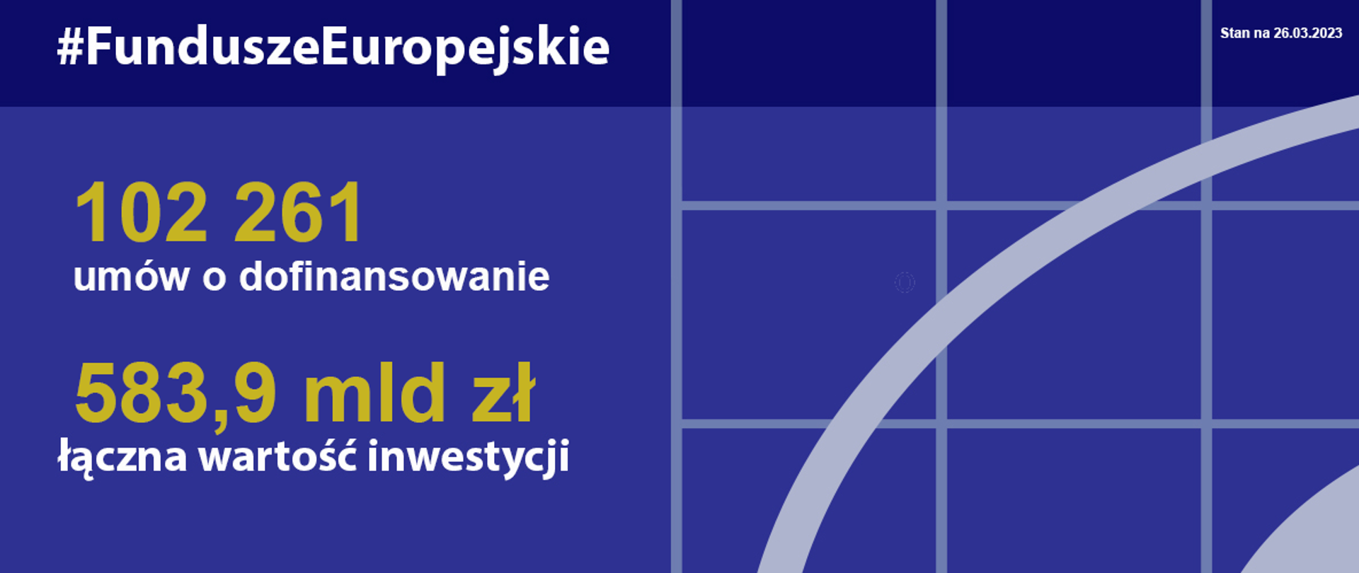 Do 26 marca 2023 roku podpisano z beneficjentami 102 261 umów o dofinansowanie projektów. Łączna wartość tych inwestycji wynosi 583,9 mld zł. W tej kwocie udział funduszy UE to 349,1 mld zł, czyli 98,8 procent alokacji środków UE.