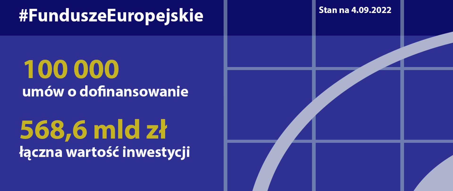 Do 4 września 2022 roku podpisano z beneficjentami 100 000 umów o dofinansowanie projektów. Łączna wartość tych inwestycji wynosi 568,6 mld zł. W tej kwocie udział funduszy UE to 346,7 mld zł, czyli 94,5 procent całej dostępnej alokacji środków UE.