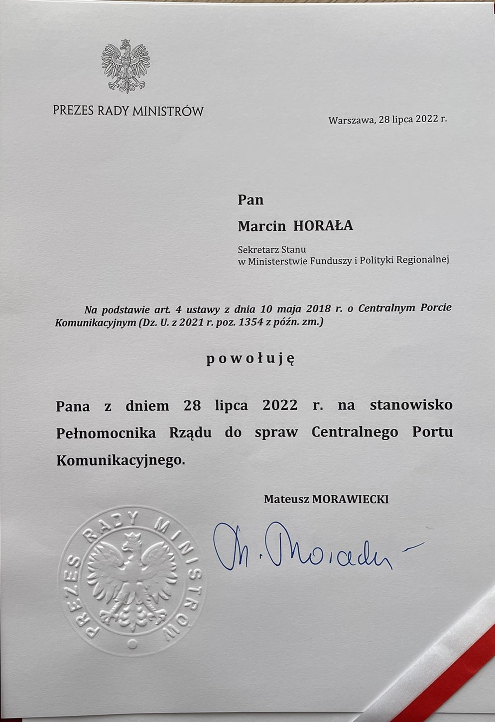 28 lipca 2022 roku Prezes Rady Ministrów Mateusz Morawiecki powołał Marcina Horałę, sekretarza stanu w Ministerstwie Funduszy i Polityki regionalnej na stanowisko Pełnomocnika Rządu do spraw Centralnego Portu Komunikacyjnego. Jednocześnie Pan Marcin Horała przestał pełnić funkcję sekretarza stanu w Ministerstwie Infrastruktury oraz Pełnomocnika Rządu do spraw Centralnego Portu Komunikacyjnego.