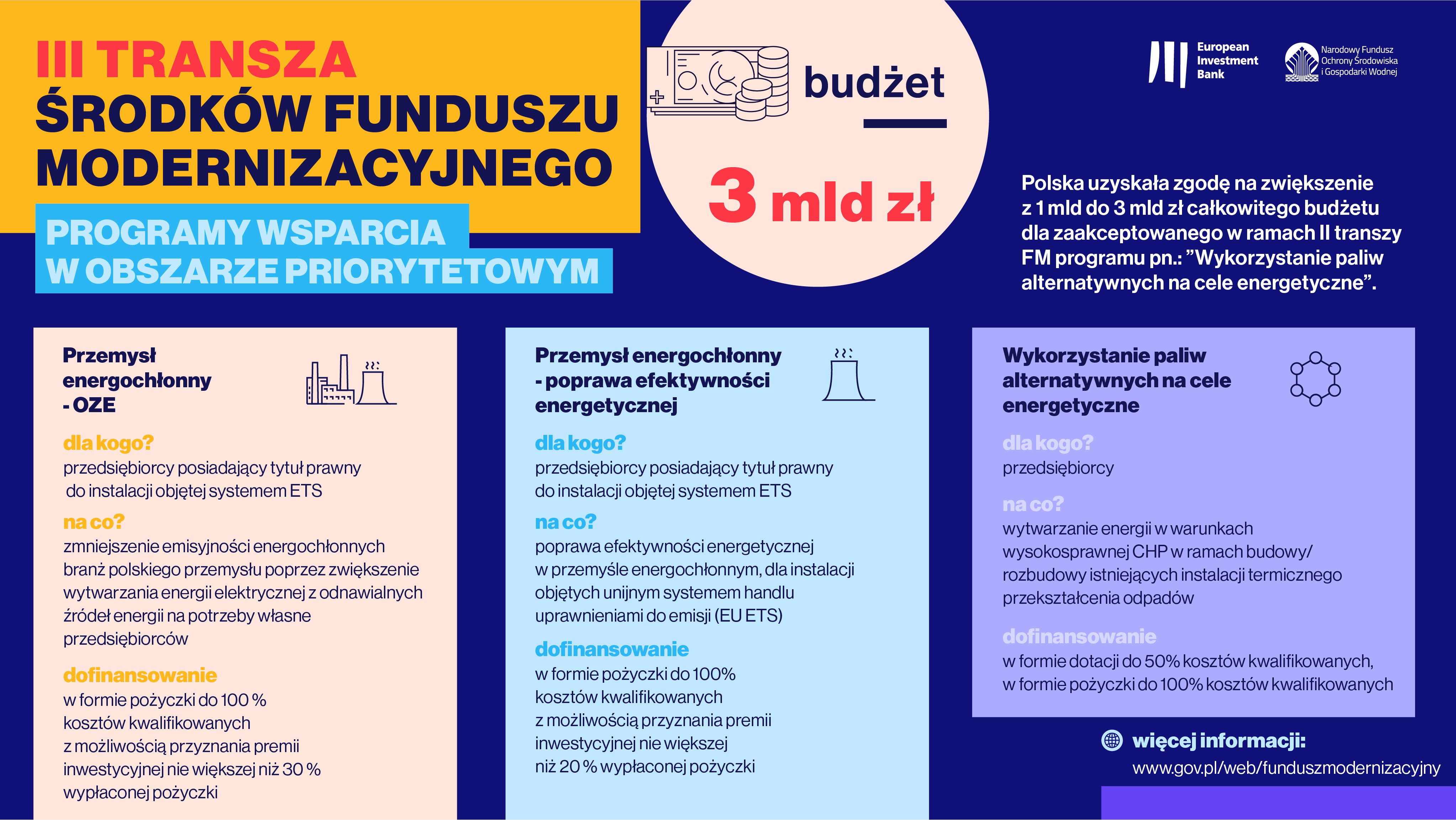 Komitet Inwestycyjny Funduszu Modernizacyjnego (FM) 7 kwietnia 2022 r. potwierdził możliwość wdrażania oraz finansowania ze środków europejskich w ramach ETS dwóch nowych programów zgłoszonych przez Polskę do III transzy Funduszu Modernizacyjnego.