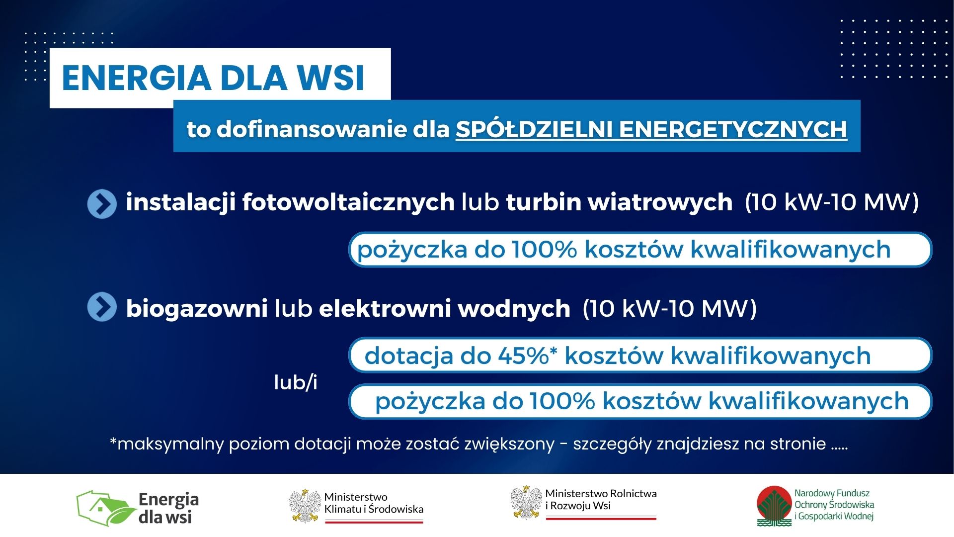 Z dofinansowania w ramach programu „Energia dla wsi” będą mogły skorzystać istniejące spółdzielnie energetyczne lub ich członkowie będący przedsiębiorcami, a także powstające spółdzielnie energetyczne oraz rolnicy – osoby fizyczne, jednostki organizacyjne nieposiadające osobowości prawnej oraz osoby prawne (które w ramach działalności rolniczej, prowadzonej przez okres co najmniej 12 miesięcy prowadzą gospodarstwo rolne w rozumieniu przepisów o podatku rolnym, położone w ramach zabudowy zagrodowej w rozumieniu przepisów o ochronie gruntów rolnych i leśnych lub dział specjalny produkcji rolnej).