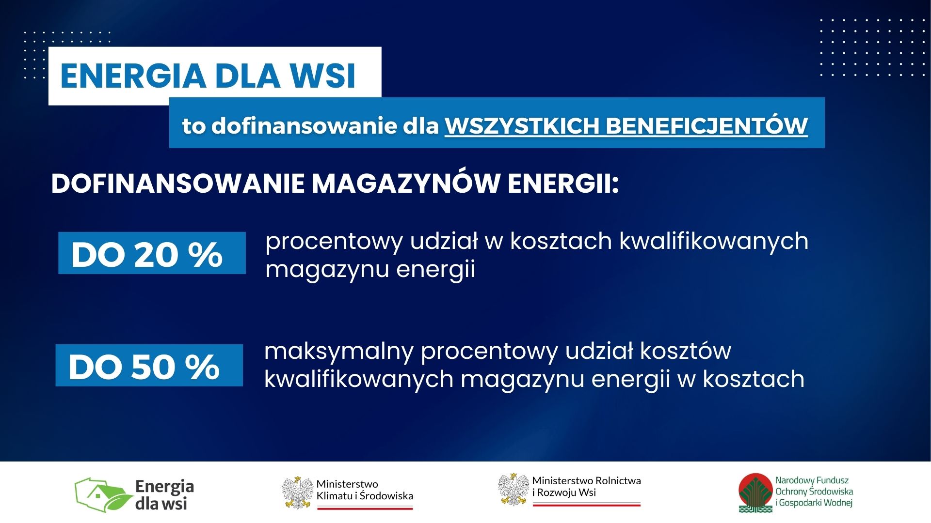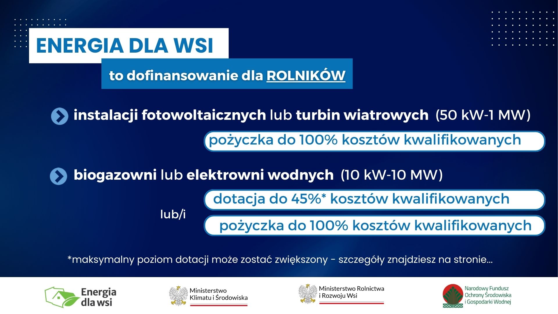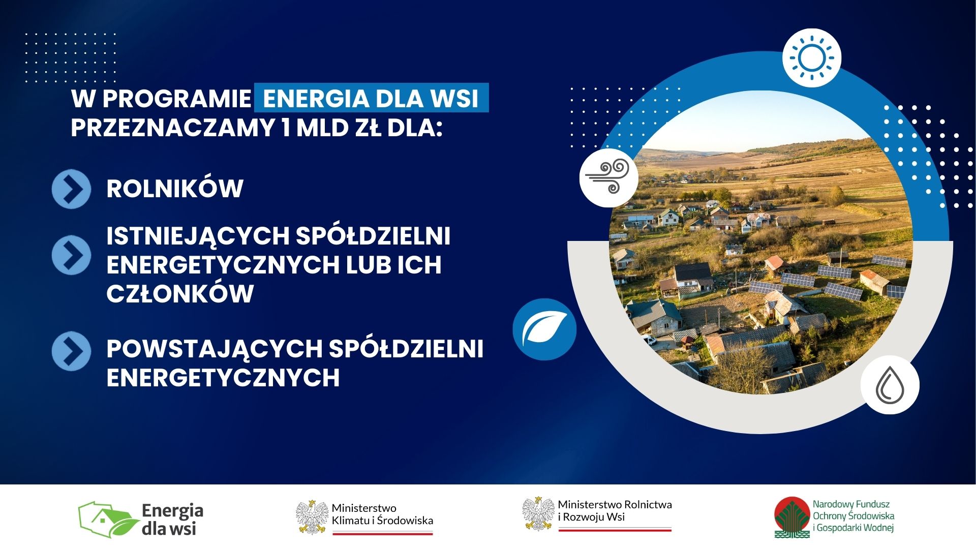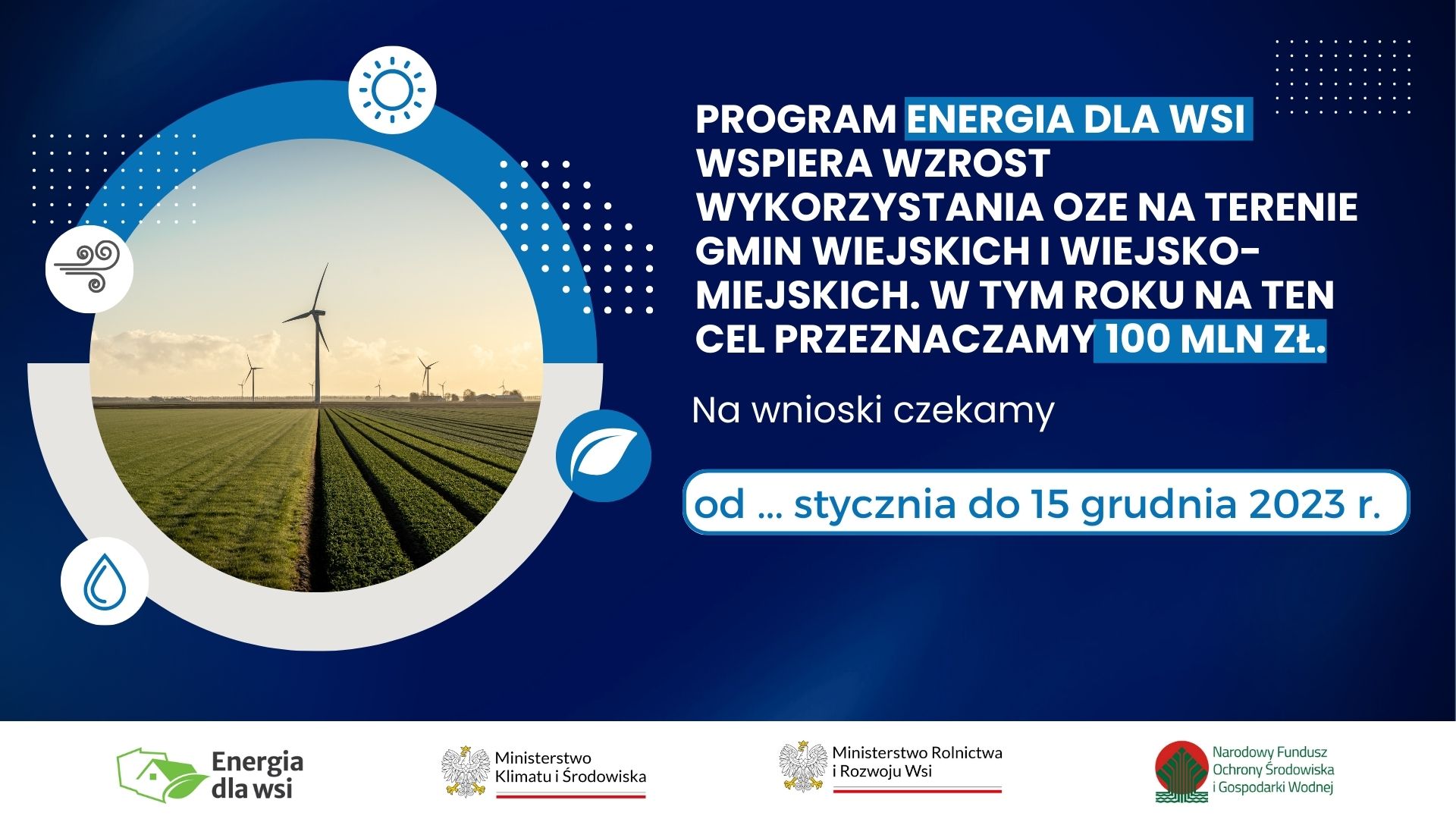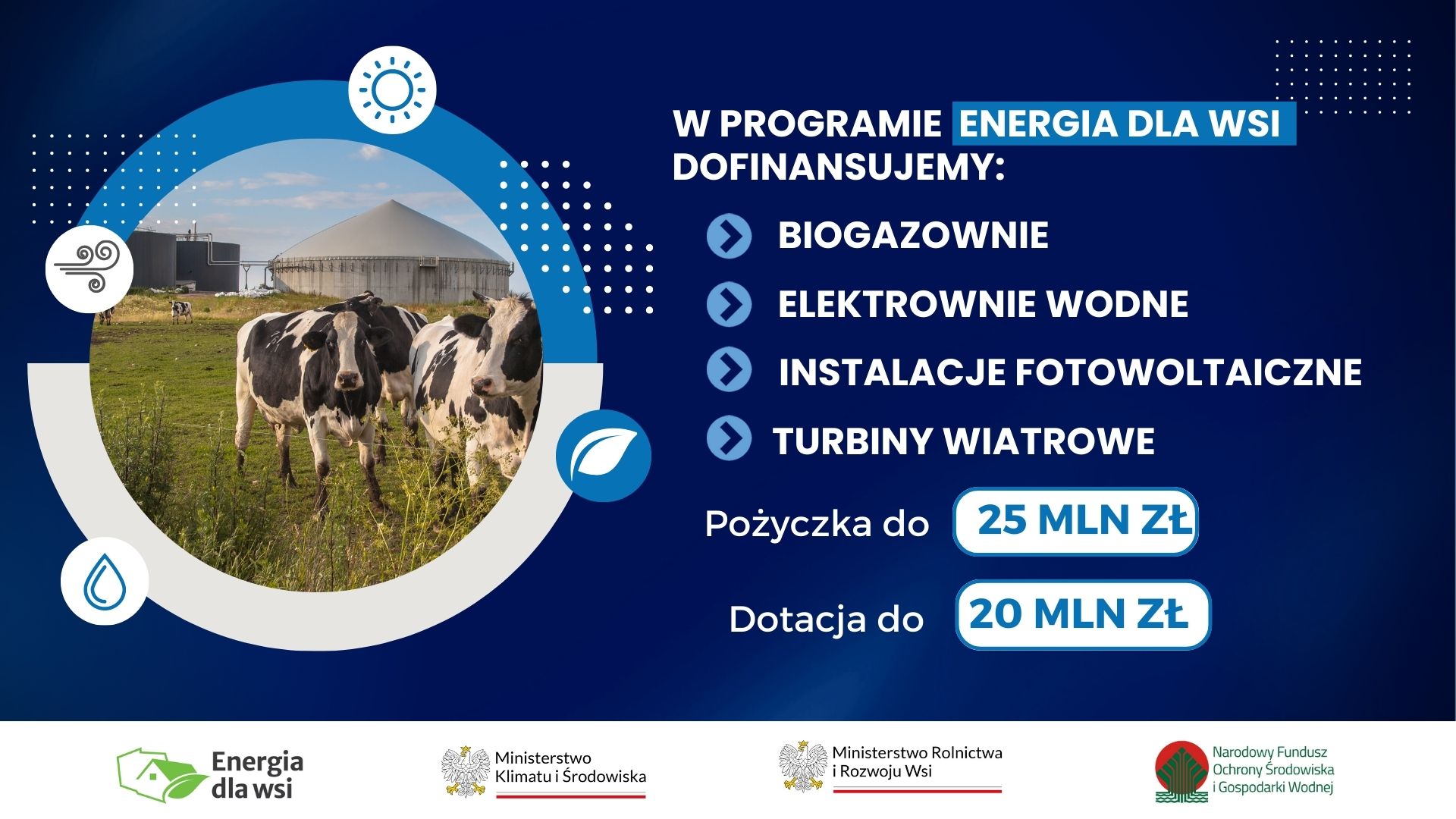 Program „Energia dla wsi” jest kontynuacją i rozszerzeniem zakończonego już naboru dla części 2) „Biogazownie i małe elektrownie wodne” programu Agroenergia. Nabory dla jego części 1) „Mikroinstalacje, pompy ciepła i towarzyszące magazyny” są nadal prowadzone przez wojewódzkie fundusze ochrony środowiska i gospodarki wodnej.