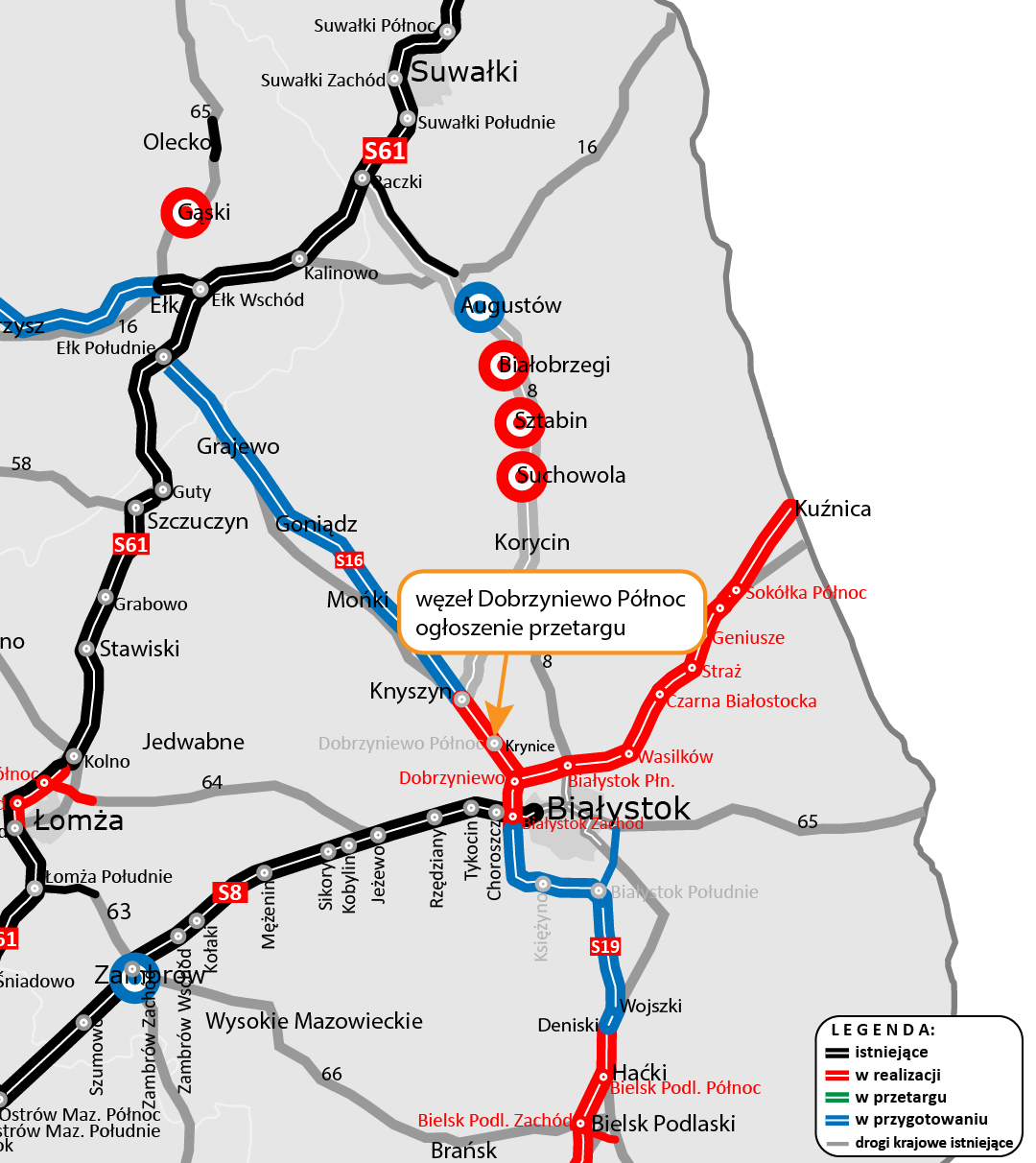Do Dziennika Urzędowego UE wysłaliśmy ogłoszenie o przetargu na wykonawcę dodatkowego węzła na realizowanym właśnie odcinku S19 Krynice - Dobrzyniewo - Białystok Zachód. Węzeł Dobrzyniewo Północ powstanie jako odrębne zadanie. Na platformie zakupowej ogłoszenie pojawi się 4 lipca bieżącego roku.