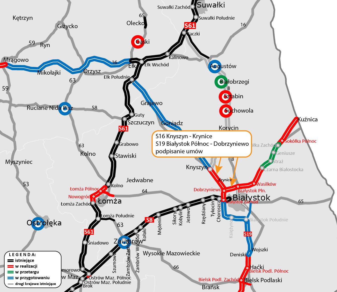 * S19 Krynice – Dobrzyniewo – Białystok Zachód (10,2 km): umowa podpisana z konsorcjum firm PORR (lider) i UNIBEP na kwotę 405,6 mln zł. Odcinek w budowie od marca bieżącego roku.